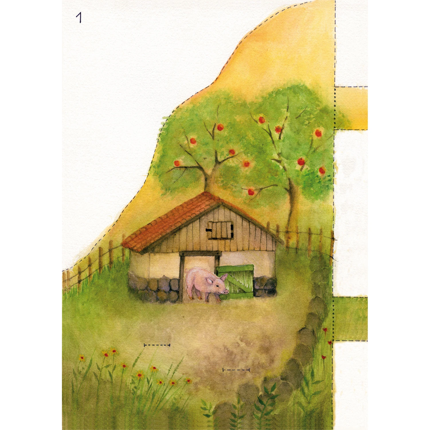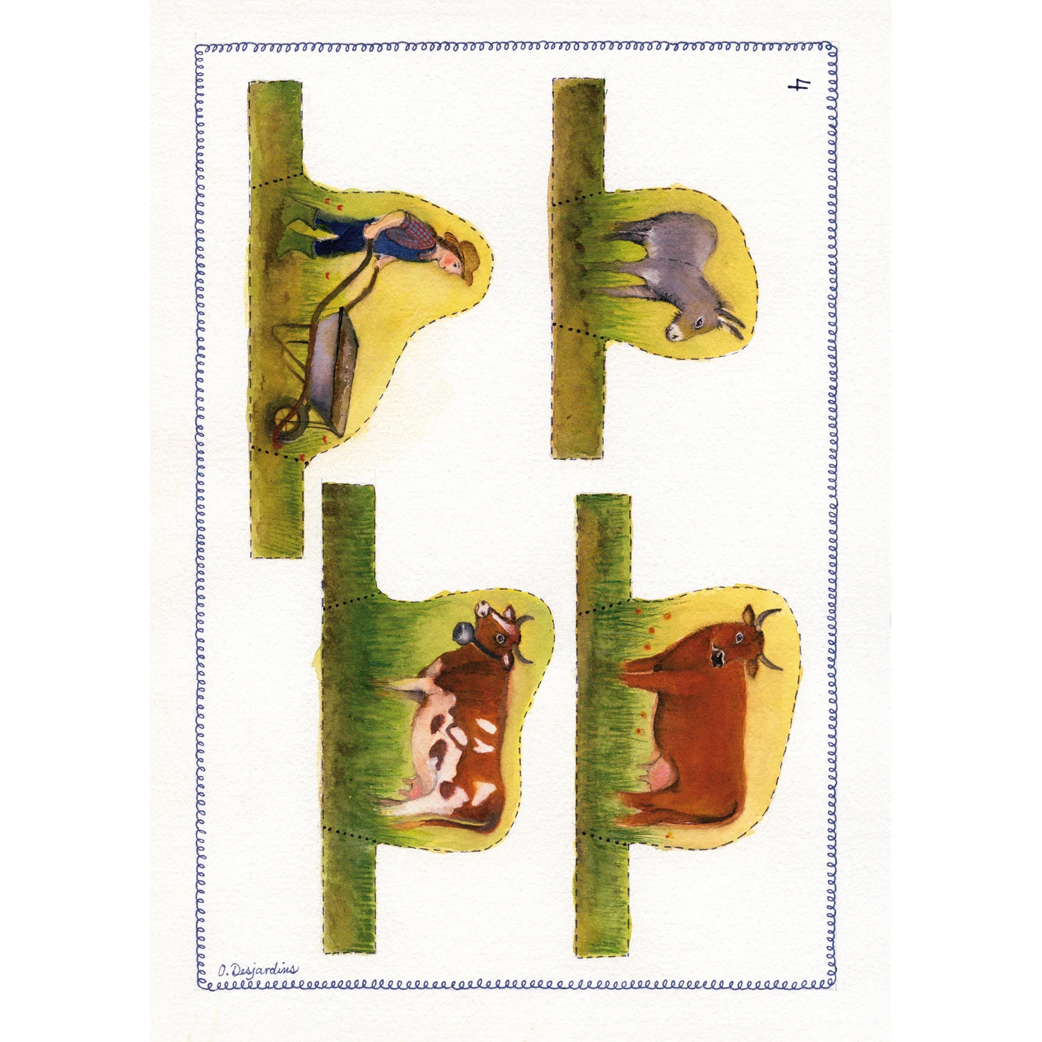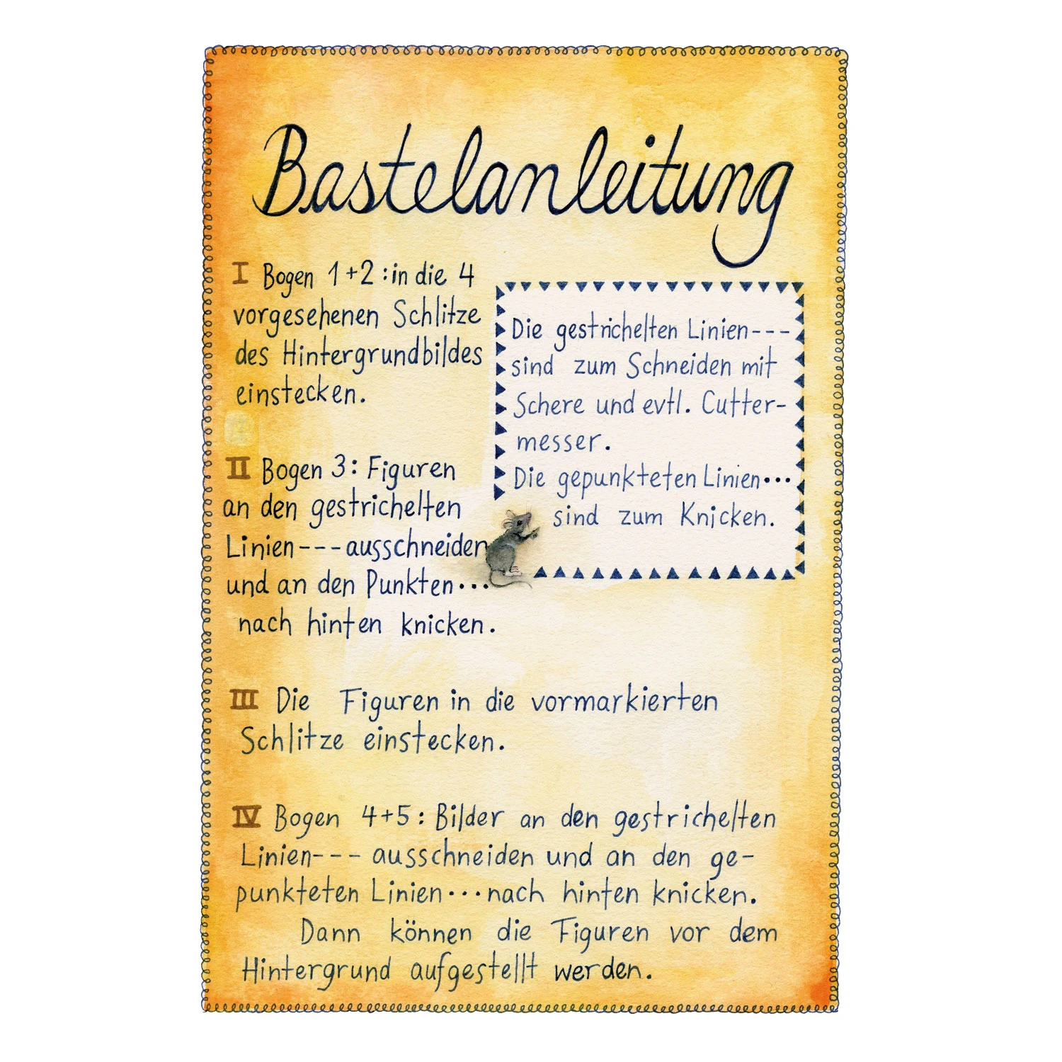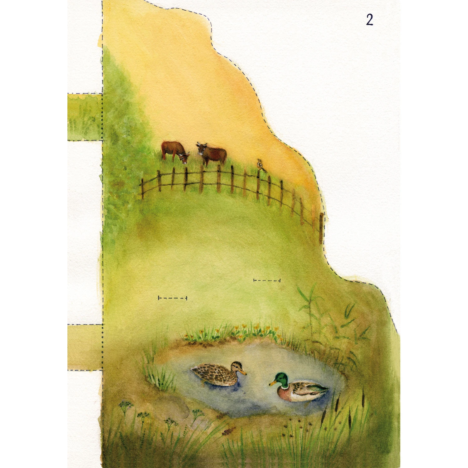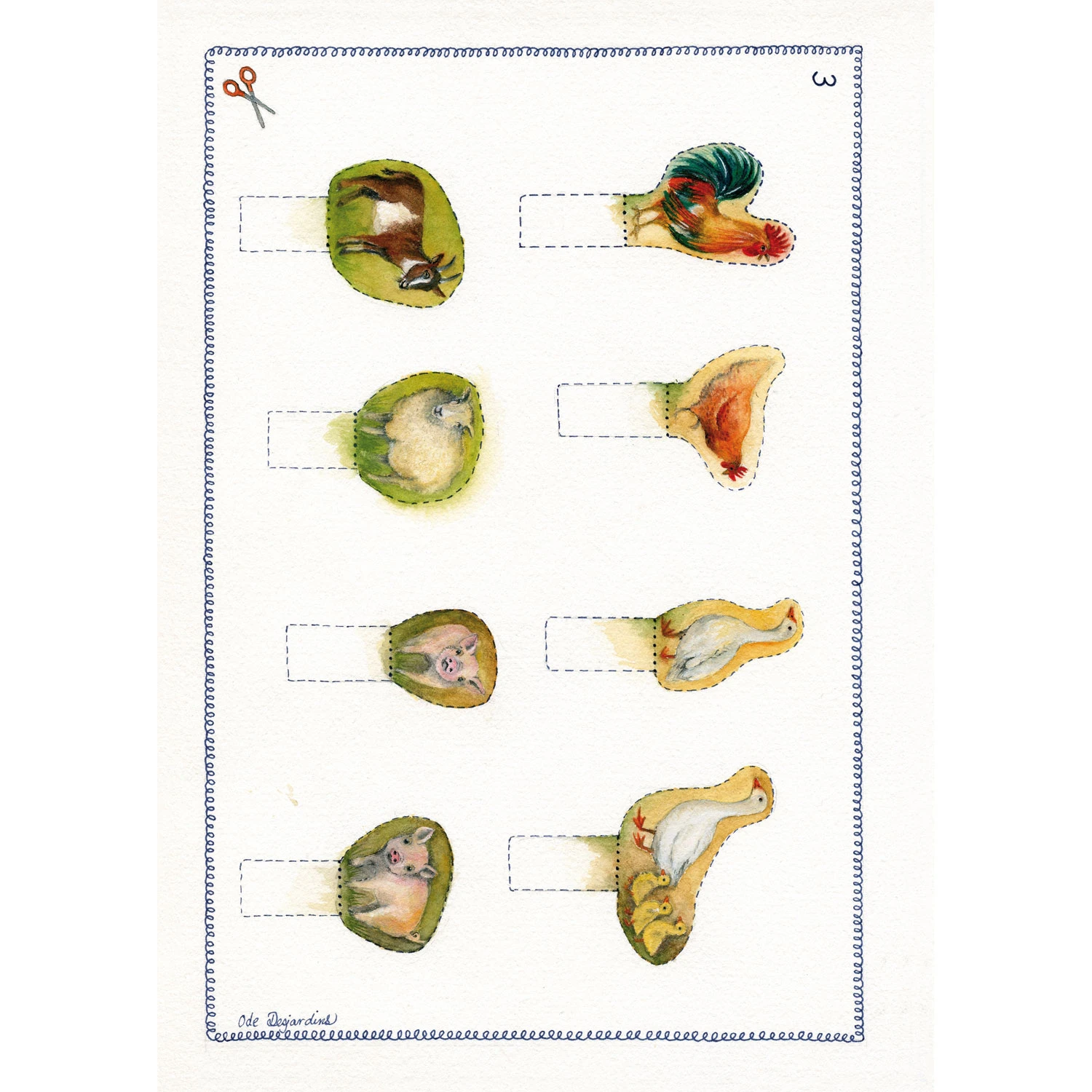 Von der Künstlerin Ode Desjardins liebevoll gestaltete Bastelbögen laden zum Ausschneiden und Spielen ein. Hintergrundbild A4 mit 5 Ausschneidebögen. Buntstift und Aquarell auf 100 % Recyclingpapier. Breite aufgestellt 76 cm.