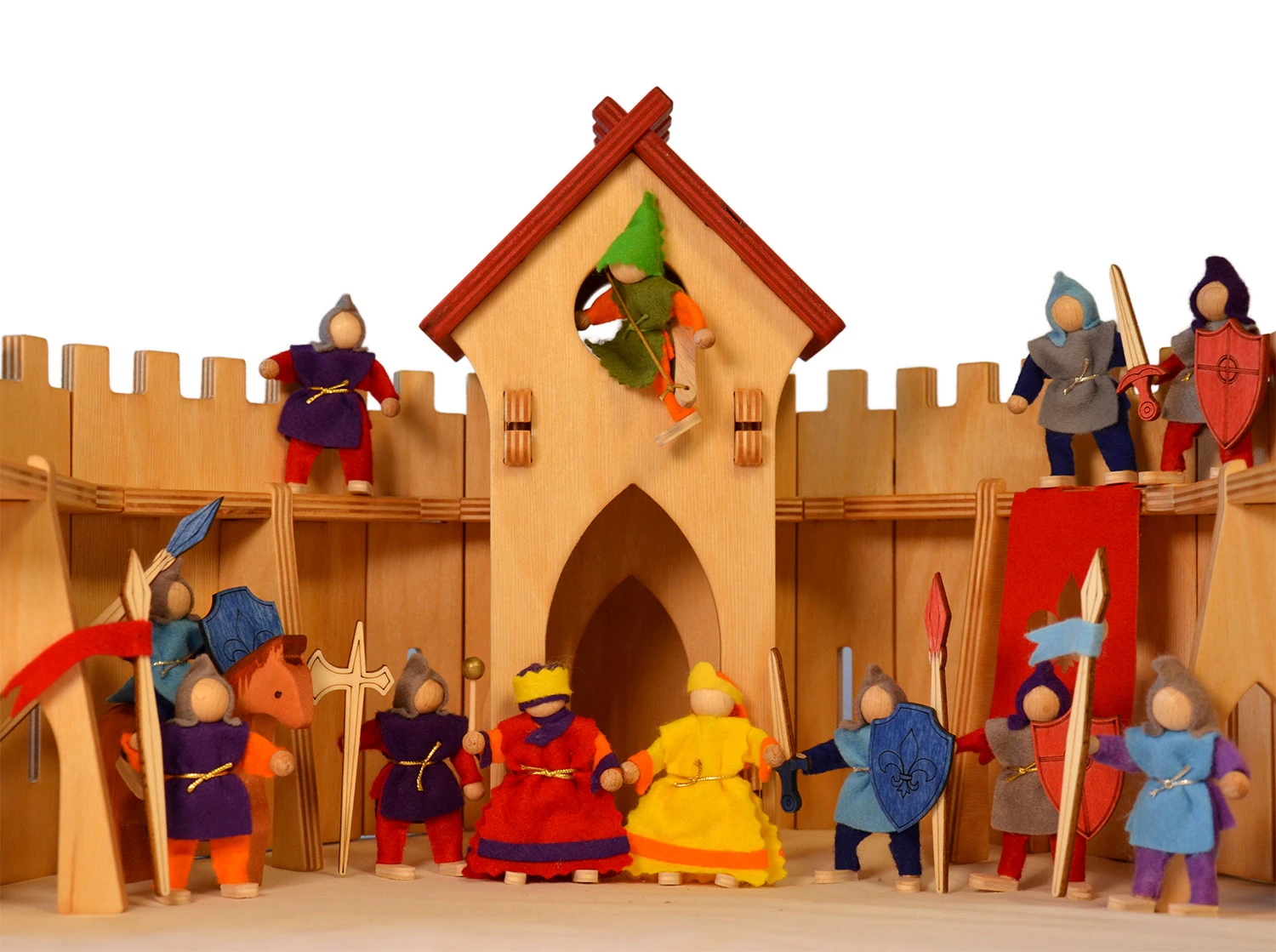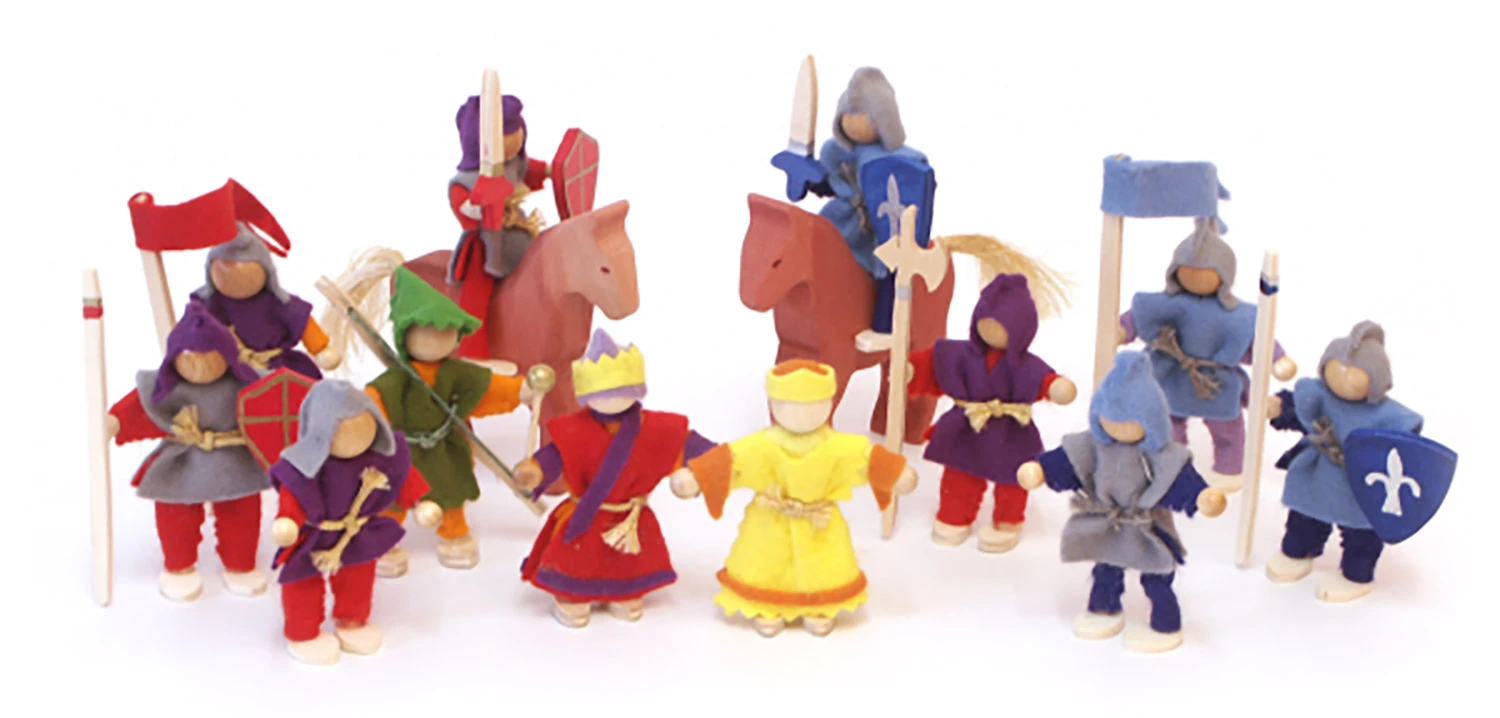 Die Biegepüppchen aus Holz und Filz können stehen, sitzen, klettern und reiten. Das 14-teilige Set besteht aus: König, Königin, Jäger, Wache, vier Ritter rot, vier Ritter blau und zwei Holzpferden.