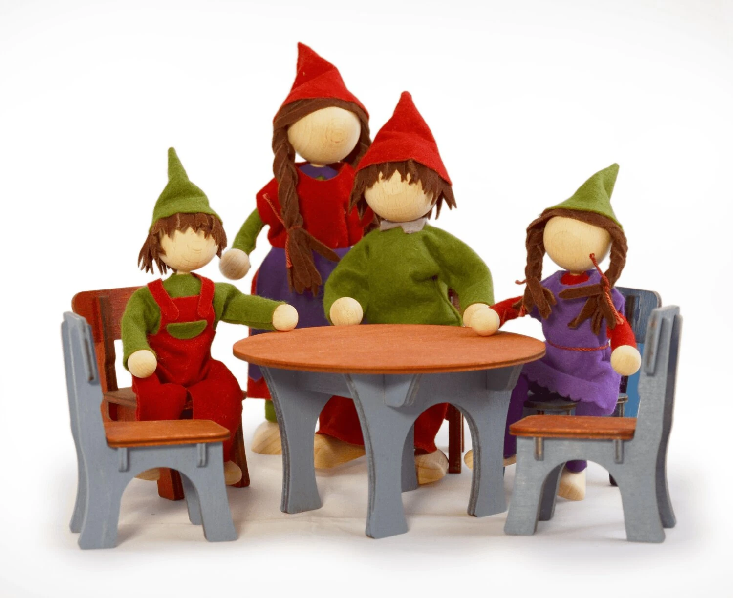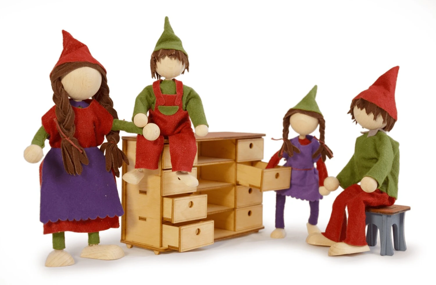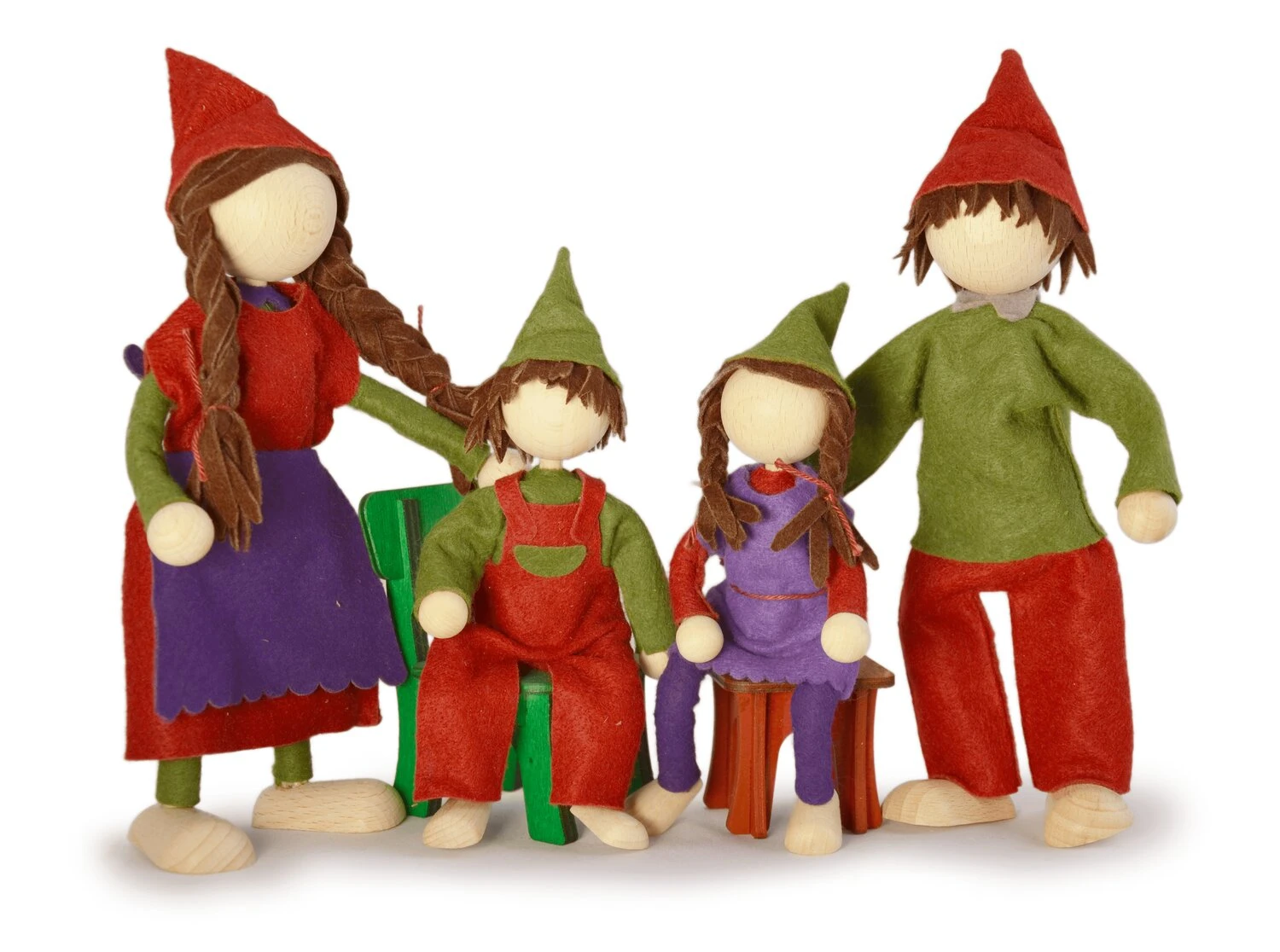 Kleine Puppenhauspuppen Familie, Vater, Mutter mit zwei Kindern mit edler Kleidung aus Wollfilz in schönen Farben, für das Spiel im Puppenhaus oder in einer selbst gestalteten Welt aus Tüchern und Bausteinen.