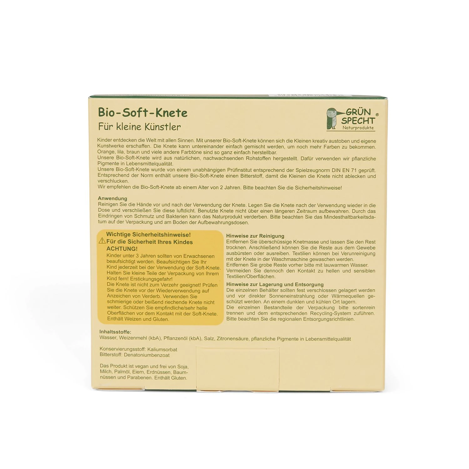 Die Bio-Soft-Knete wird in Deutschland aus natürlichen und nachwachsenden Rohstoffen hergestellt. Die Farben sind in Lebensmittelqualität. Die Knete klebt nicht und trocknet an der Luft. Sie ist weich, leicht zu formen und gut mischbar.