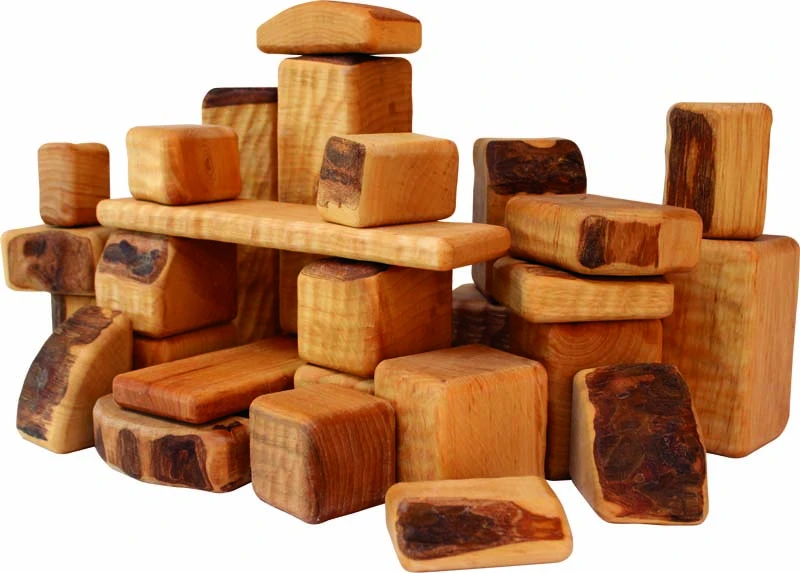 30 unterschiedliche Bauklötzen aus geölter Erle mit fest am Holz sitzender Borke. Die Größe der einzelnen Bauklötze schwankt zwischen ca. 3 und 10 cm. Besonders geeignet für Kinder ab 3 Jahre.