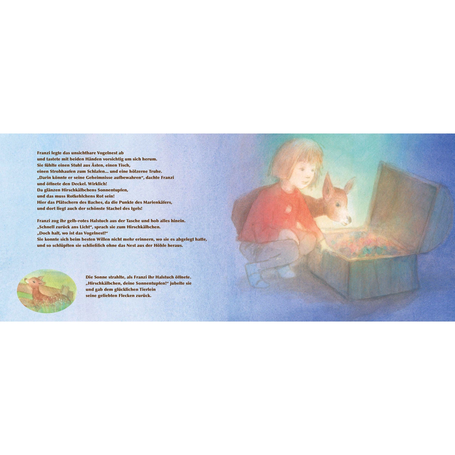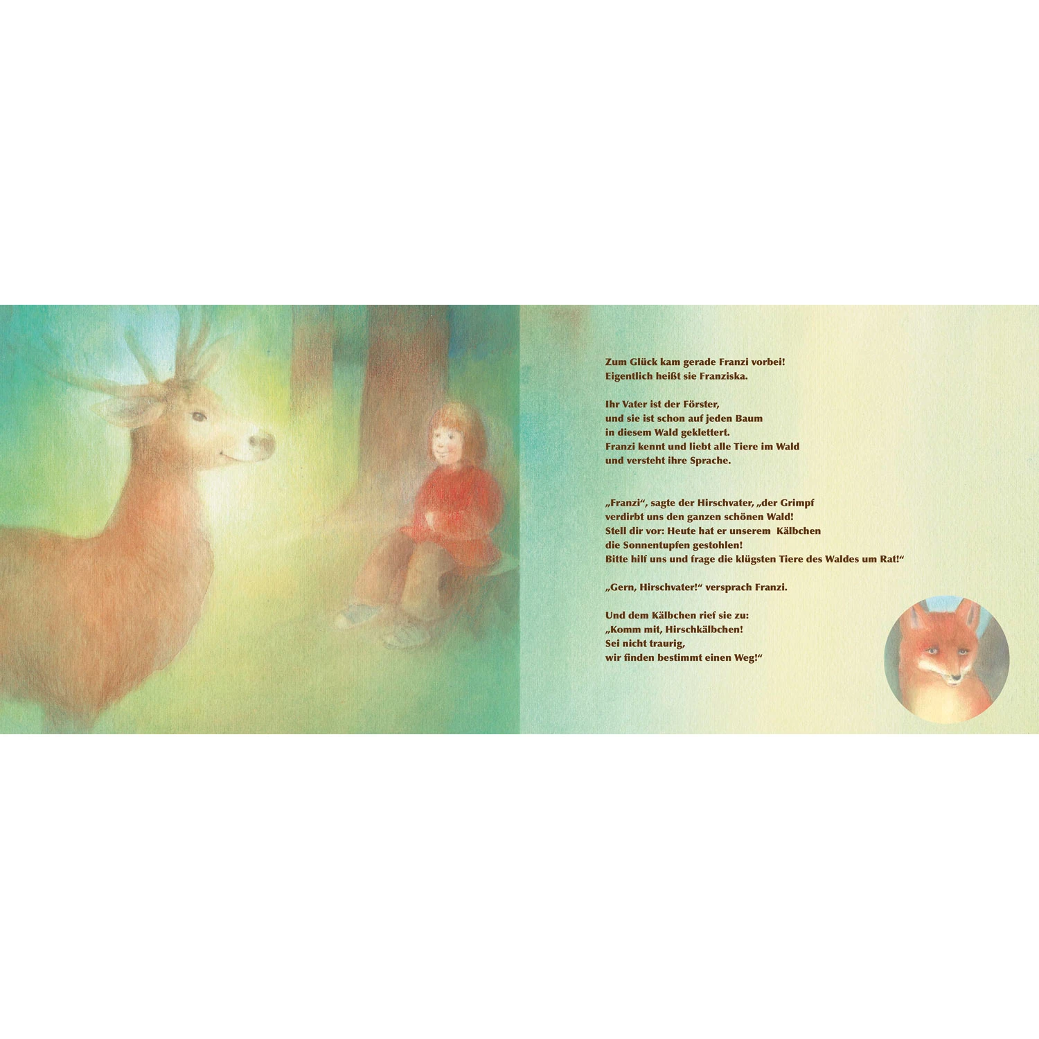 Der Grimpf hat dem Rotkehlchen sein schönes Rot gestohlen, dem Marienkäfer seine Punkte, dem Igel seinen schönsten Stachel und dem Bach sein murmelndes Plätschern! Heute hat er gar dem Hirschkälbchen seine Sonnentupfen weggenommen und in seine unterirdische Höhle geschleppt.