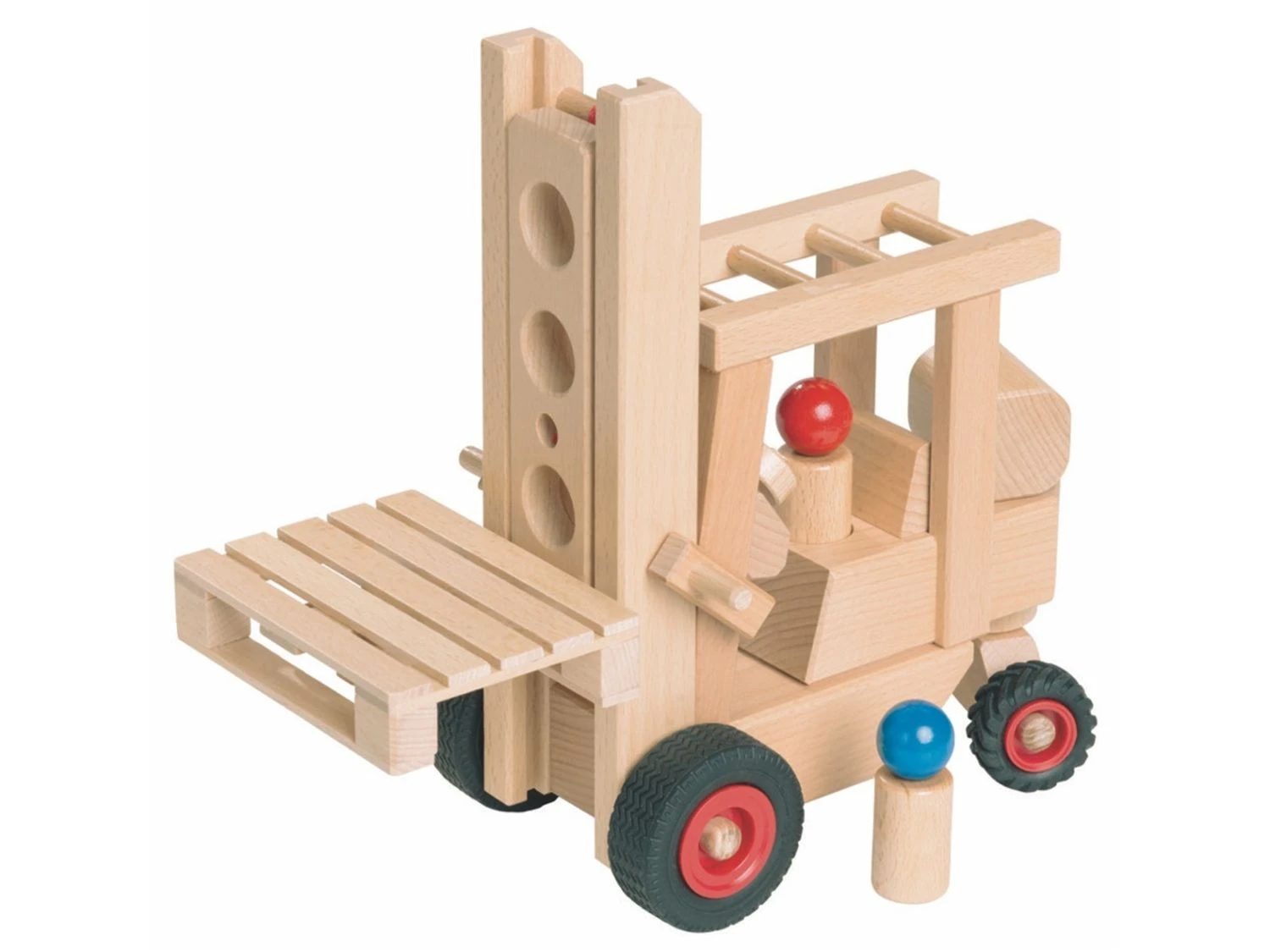 Dieser Gabelstapler mit zwei Figuren und einer Palette hat eine bewegliche Gabel und eine lenkbare Hinterachse.