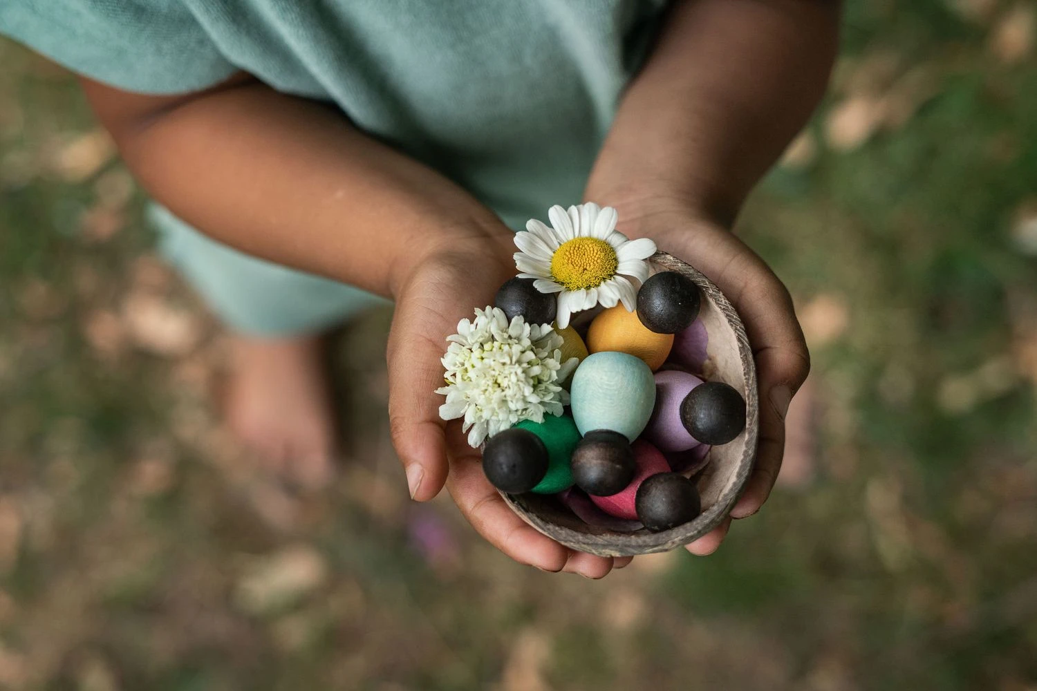 Inhalt: 6 Holzfiguren, 1 Kokosnussschale