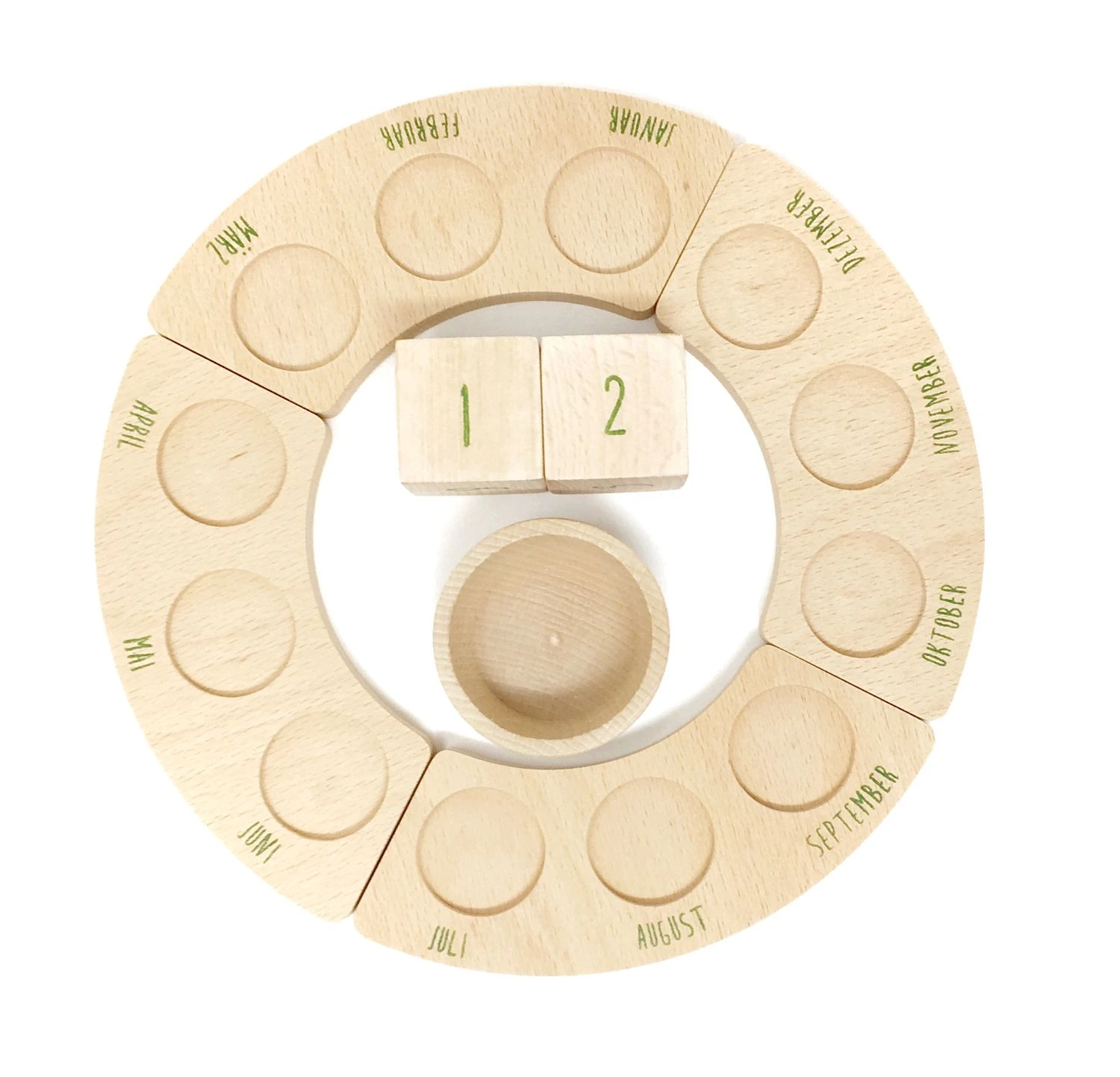Inhalt: 1 Schale, 2 Würfel mit aufgedruckten Tageszahlen, eine vier geteilte Plattform (für die Jahreszeiten und mit aufgedruckten Monatsnamen)