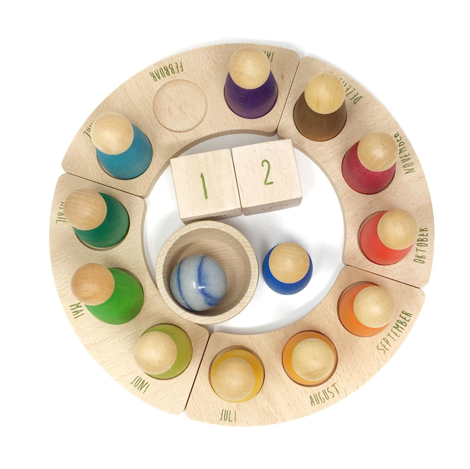 Inhalt: 12 Holzfiguren, 1 Schale, 2 Würfel mit aufgedruckten Tageszahlen, eine vier geteilte Plattform (für die Jahreszeiten und mit aufgedruckten Monatsnamen)