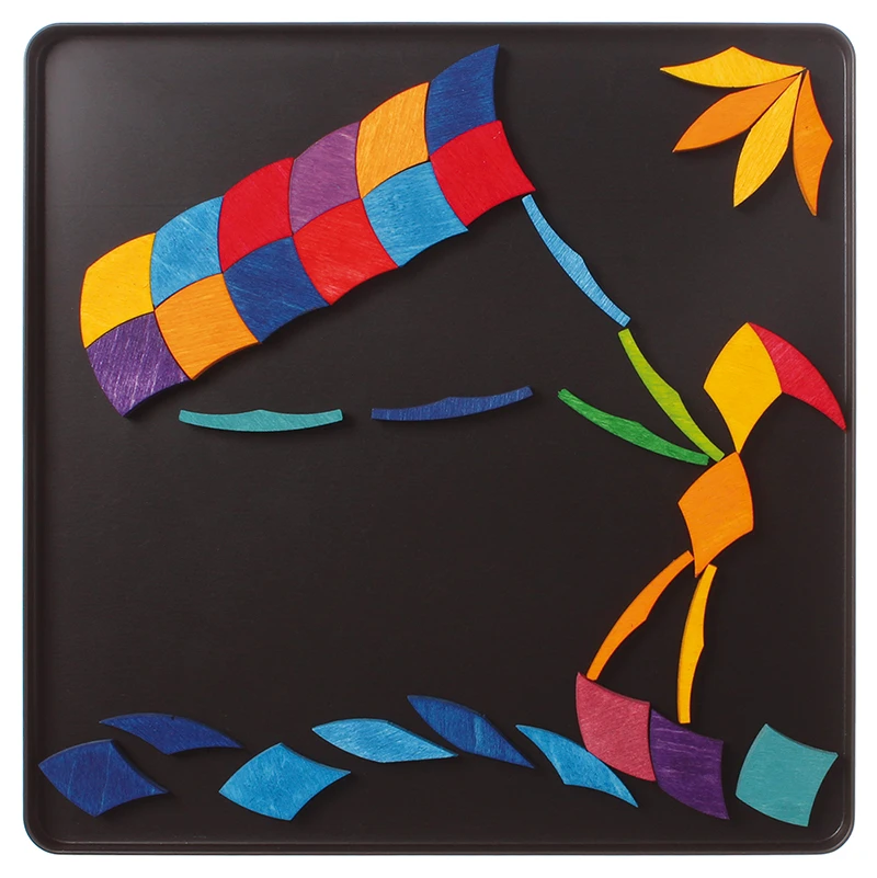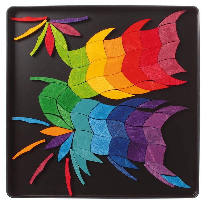 72 farbenfrohe Puzzleteil die zu immer neuen Figuren und Formen zusammengelegt werden können. So entstehen Mandalas und Bilder aus den bunten Magnet Puzzle Teilen. Das Spiel mit dem Magnet Farbenspiel von Grimm’s fördert die Feinmotorik, die Kreativität, fantasievolle Spiel und das abstrakte Denken. Die Bilder sind ein edler Raumschmuck, sie können je nach Stimmung und Jahreszeit frei umgestaltet werden. Die Formen udn Bauelemente aus Birken – oder Pappelsperrholz sind farbig lasiert. Farben sind entsprechend den aktuell gültigen Normen für Spielzeugsicherheit EN 71 zertifiziert.