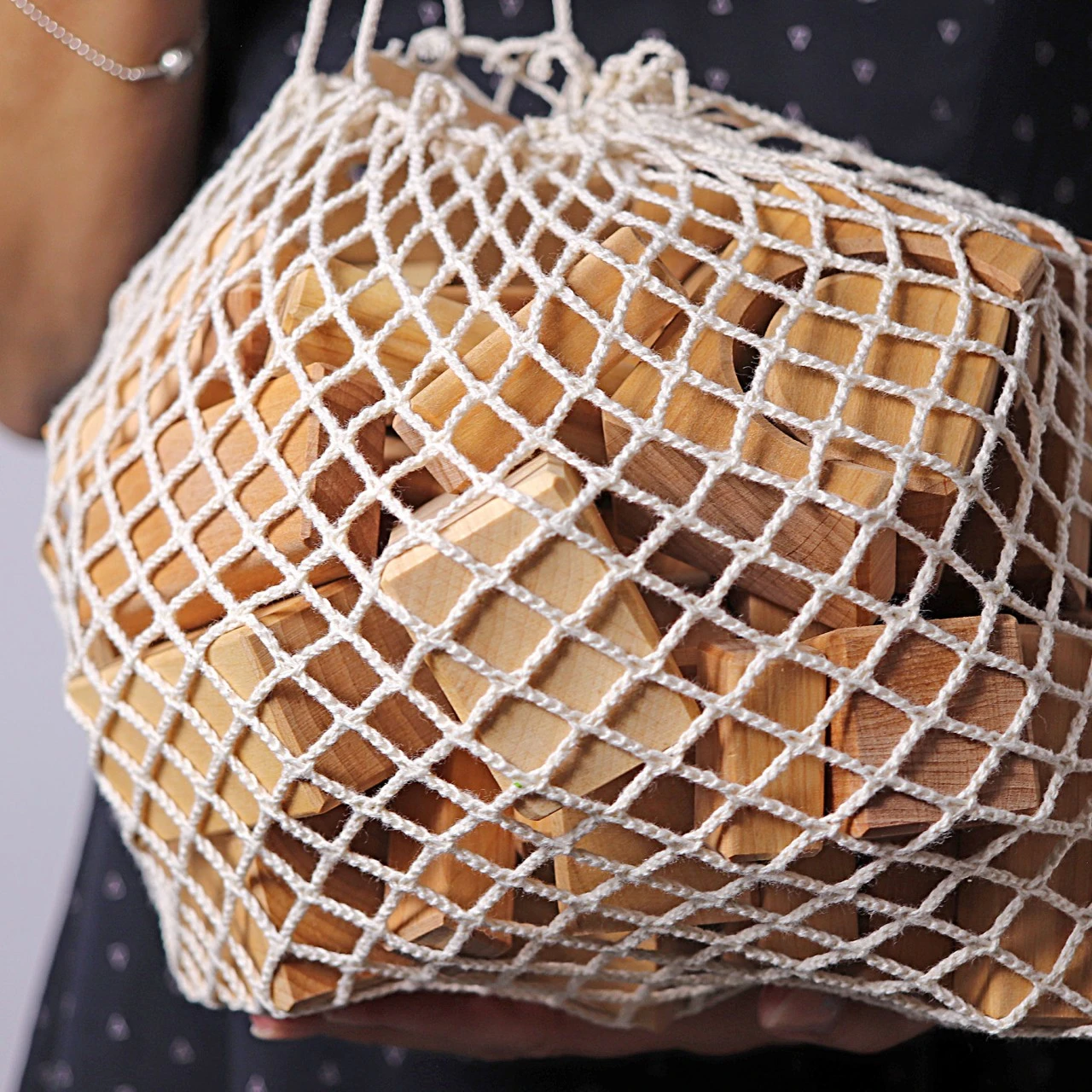 Die klaren Formen der Bausteine eignen sich wunderbar zum Bauen von Häusern, Burgen, Schlössern und vielen anderen Gebäuden. 60 Bauklötze aus Lindenholz im Netz. Maße: 1 cm, 2 cm und 4 cm Stärke.