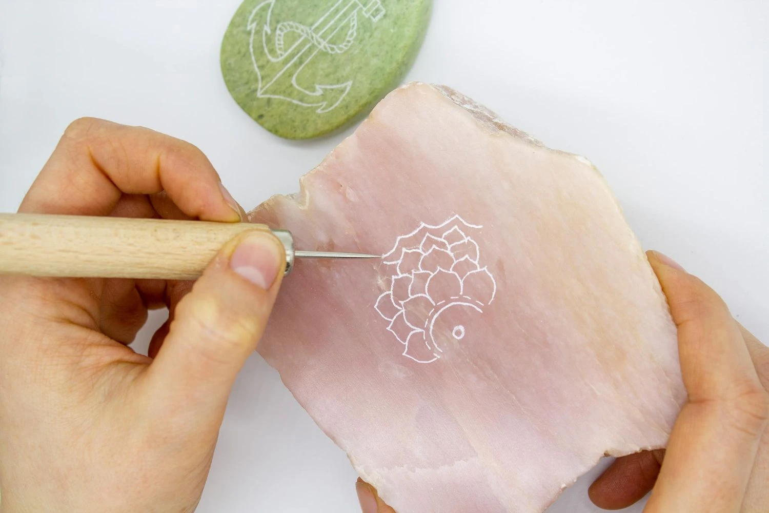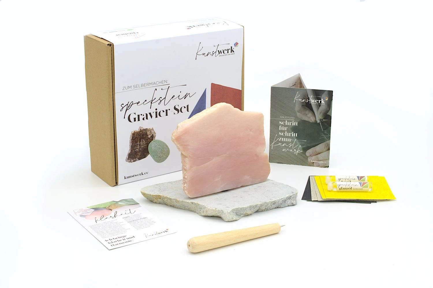Mit diesem Speckstein-Gravier-Set können auf einfache Weise, Gravuren, Wörter, Zahlen, Linien oder kleine Zeichnungen in eine Specksteinplatte geritzt werden. Alles was man dazu braucht ist dabei.