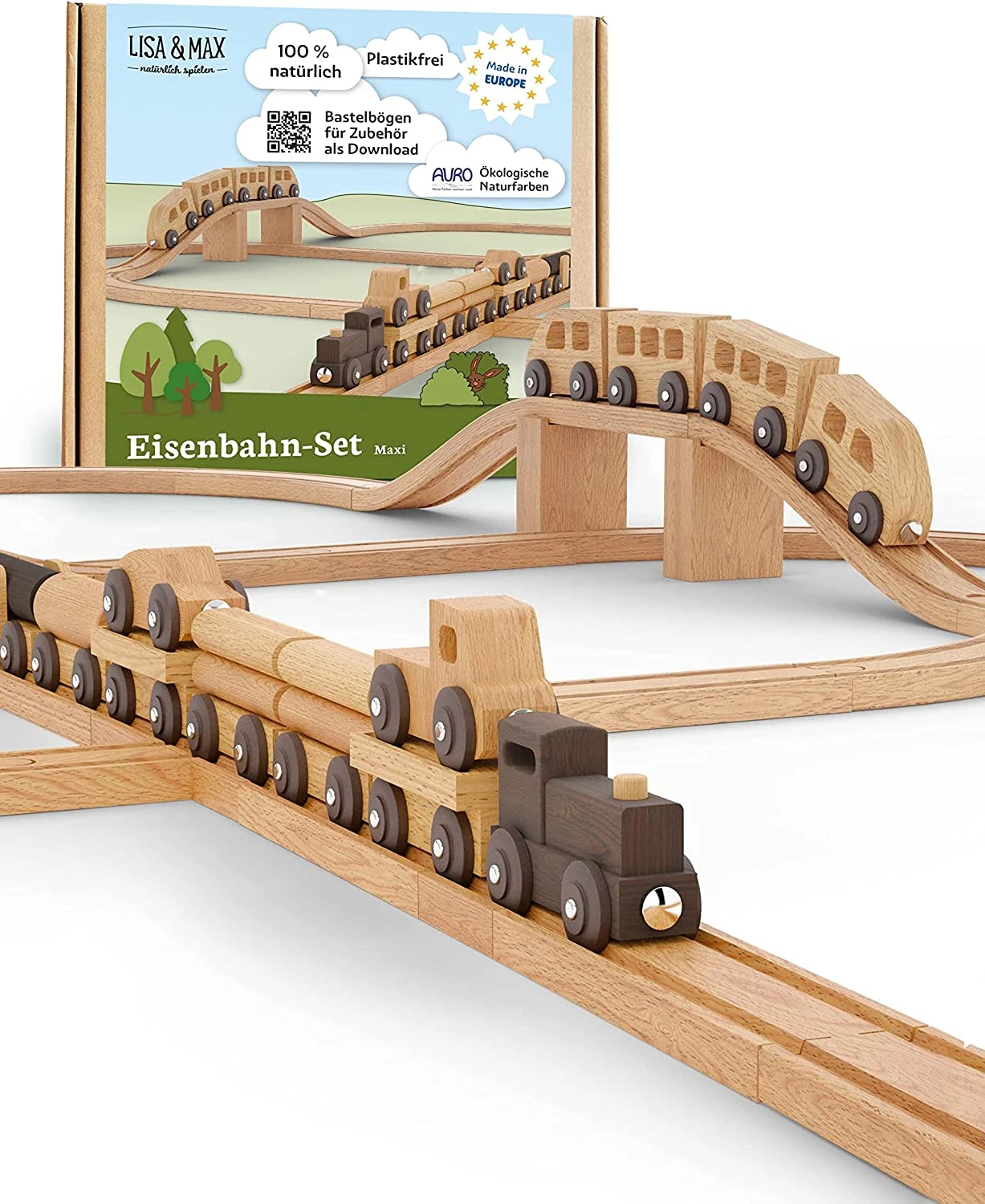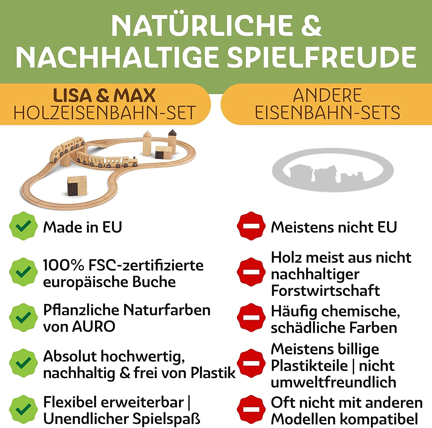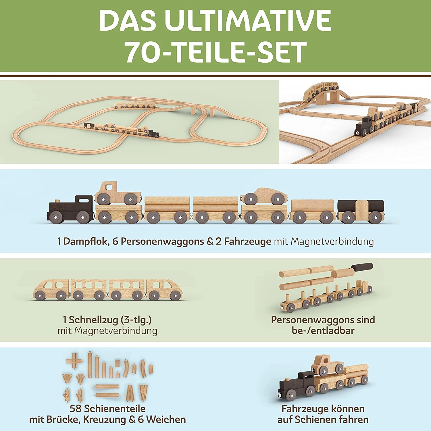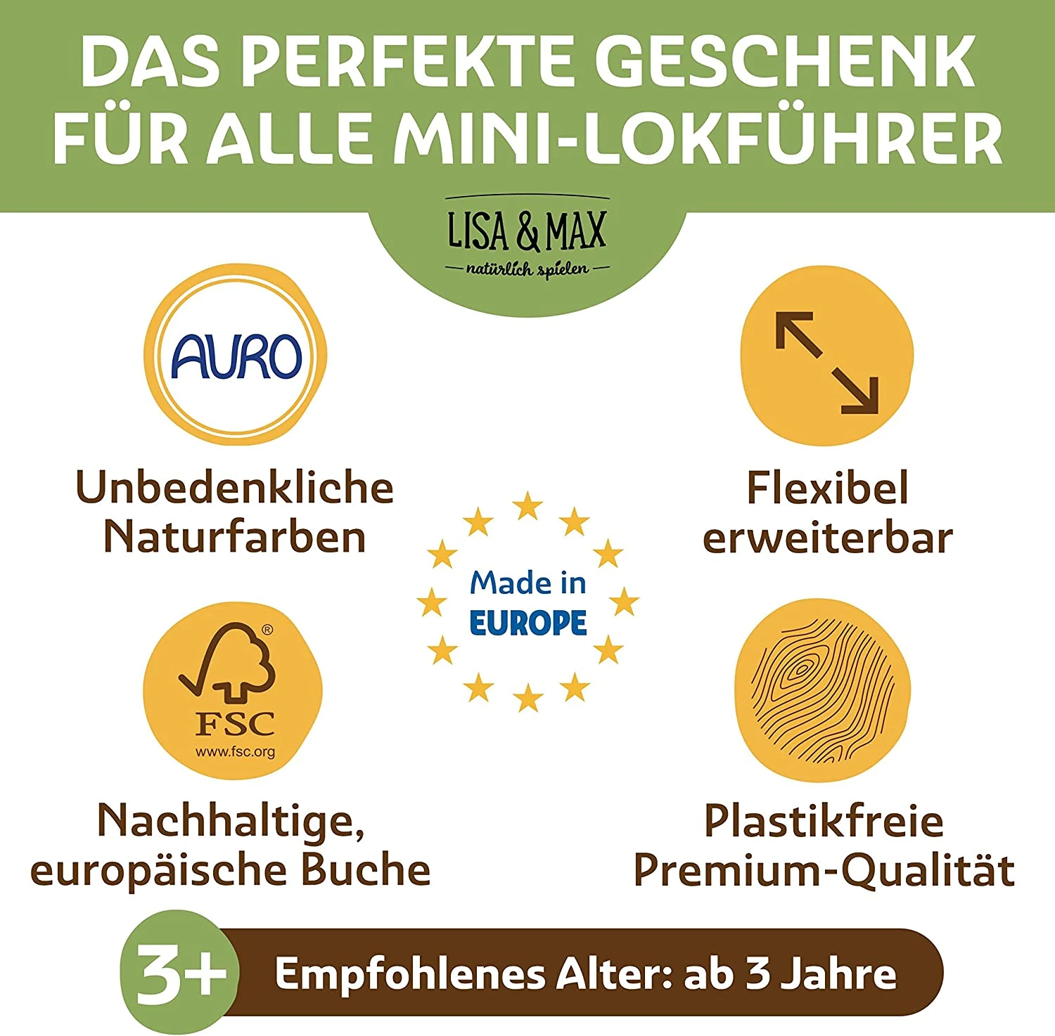 Eine hochwertige, langlebige Holzeisenbahn für die ganze Familie. Spielvergnügen ohne Ende! Höchste Qualität, Nachhaltigkeit & Sicherheit! Dieses große Bahnset aus 100 % europäischer, FSC-zertifizierter Buche gefertigt & mit unbedenklichen, pflanzlichen Naturfarben von AURO vollendet! Diese Holzeisenbahn kommt ganz ohne Plastik aus! Das Set besteht aus: Dampflok, 6 Personenwagen die be-und entladen werden können, 2 Fahrzeugen die auf den Schienen fahren können, 1 Schnellzug, 3 tlg., 58 Schienenteilen, Brücken, Kreuzung, 6 Weichen.