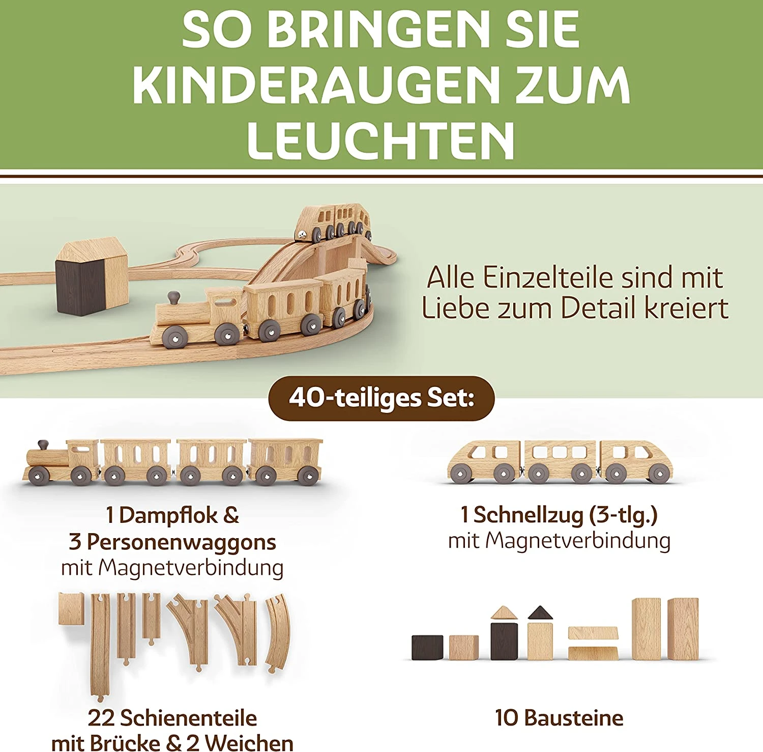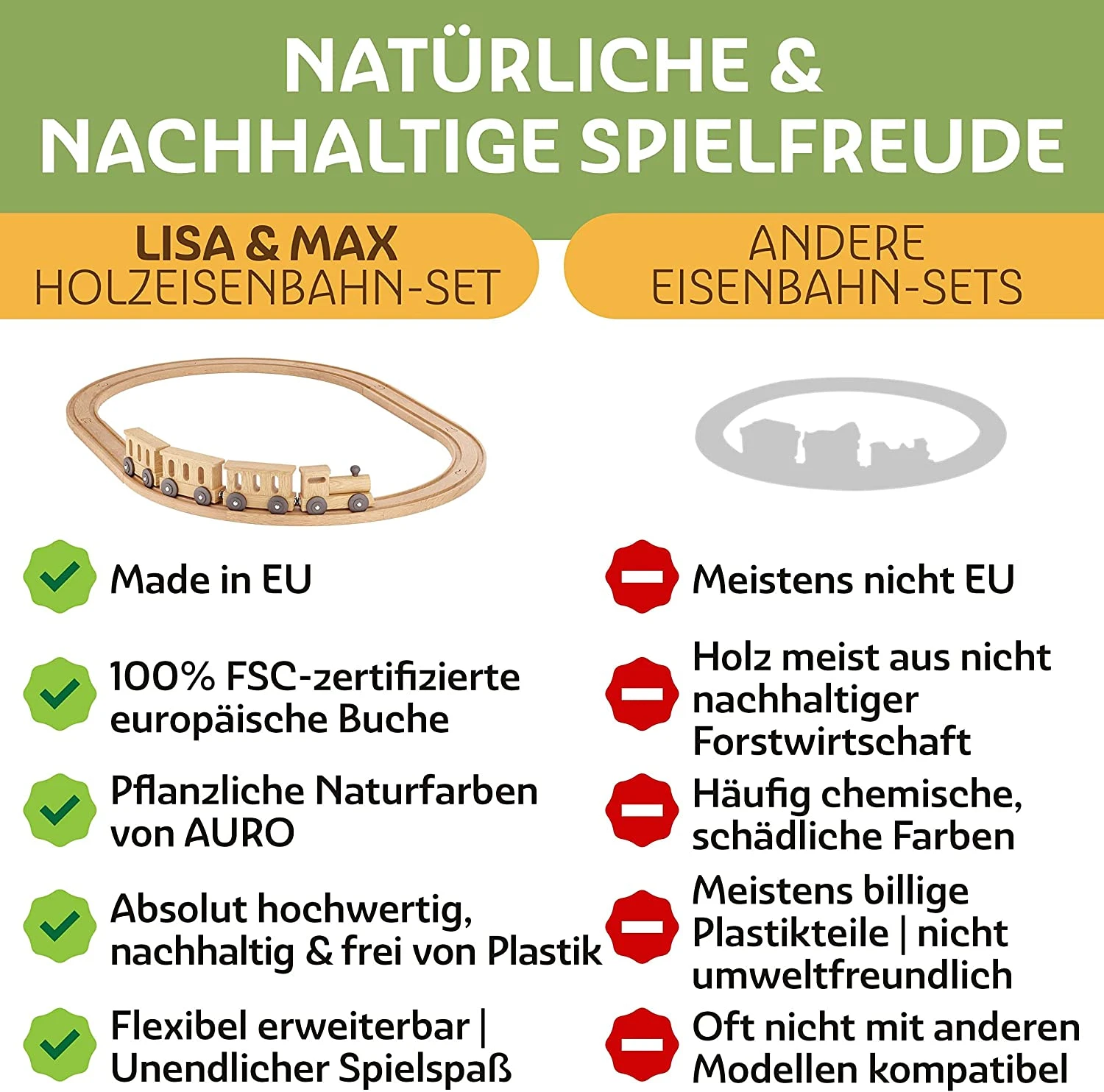 Eine hochwertige, langlebige Holzeisenbahn mit viel kreativem Spielvergnügen! Höchste Qualität, Nachhaltigkeit und Sicherheit! Diese Holzeisenbahn wird aus 100 % europäischer, FSC-zertifizierter Buche gefertigt & mit unbedenklichen, pflanzlichen Naturfarben von AURO vollendet – 0% Plastik. Ein besonderes Bahnset für kreativen und fantasievollen Spielspaß.
