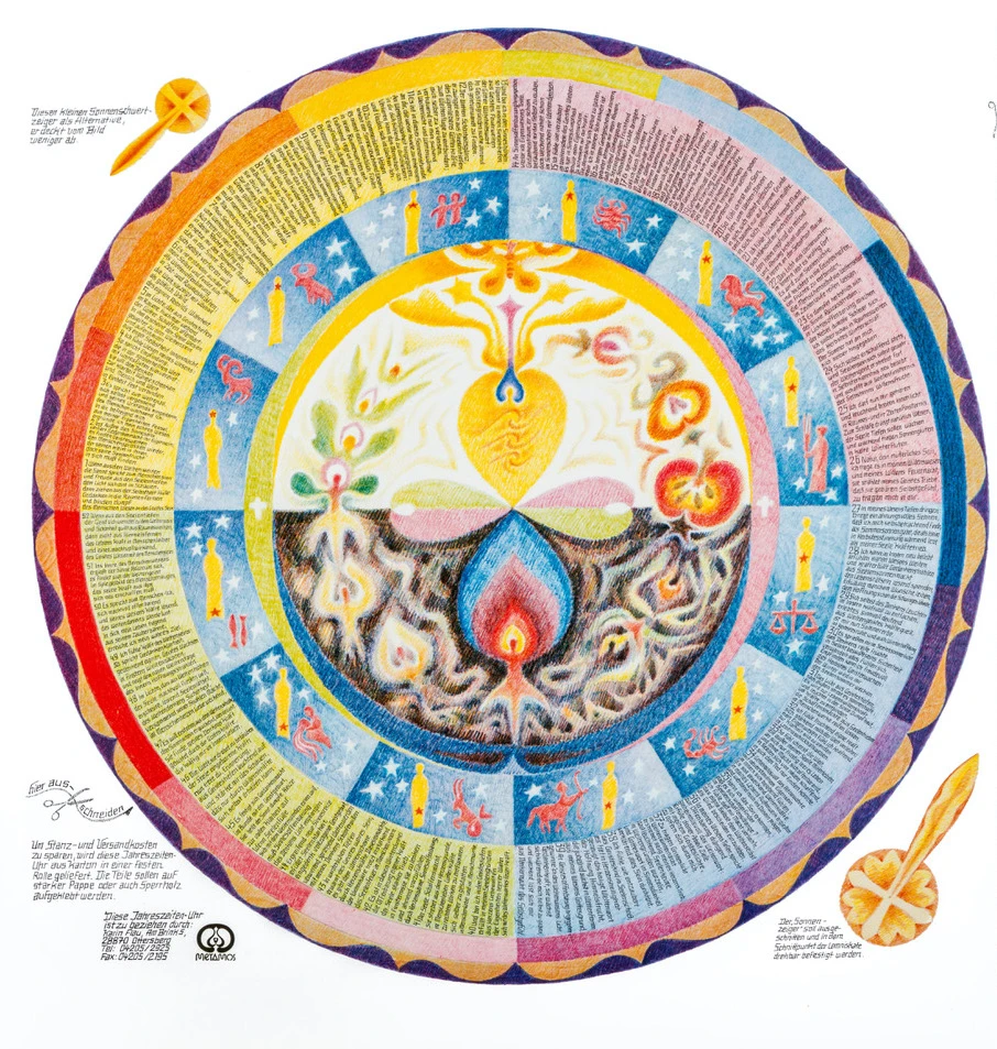 Bastelset für eine Jahreszeiten-Uhr mit zwei Zeigern zum Aufkleben auf eine Sperrholzplatte sowie Text zur Erläuterung mit Abbildungen. Maße: 39 x 43 cm.