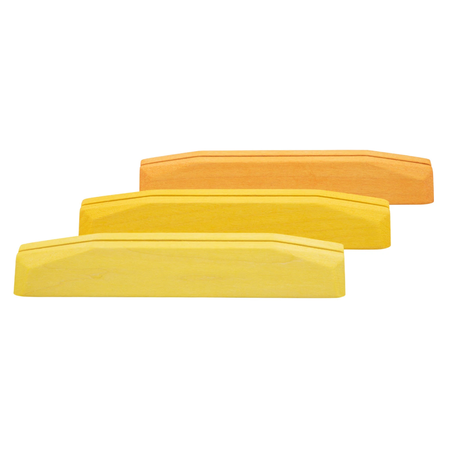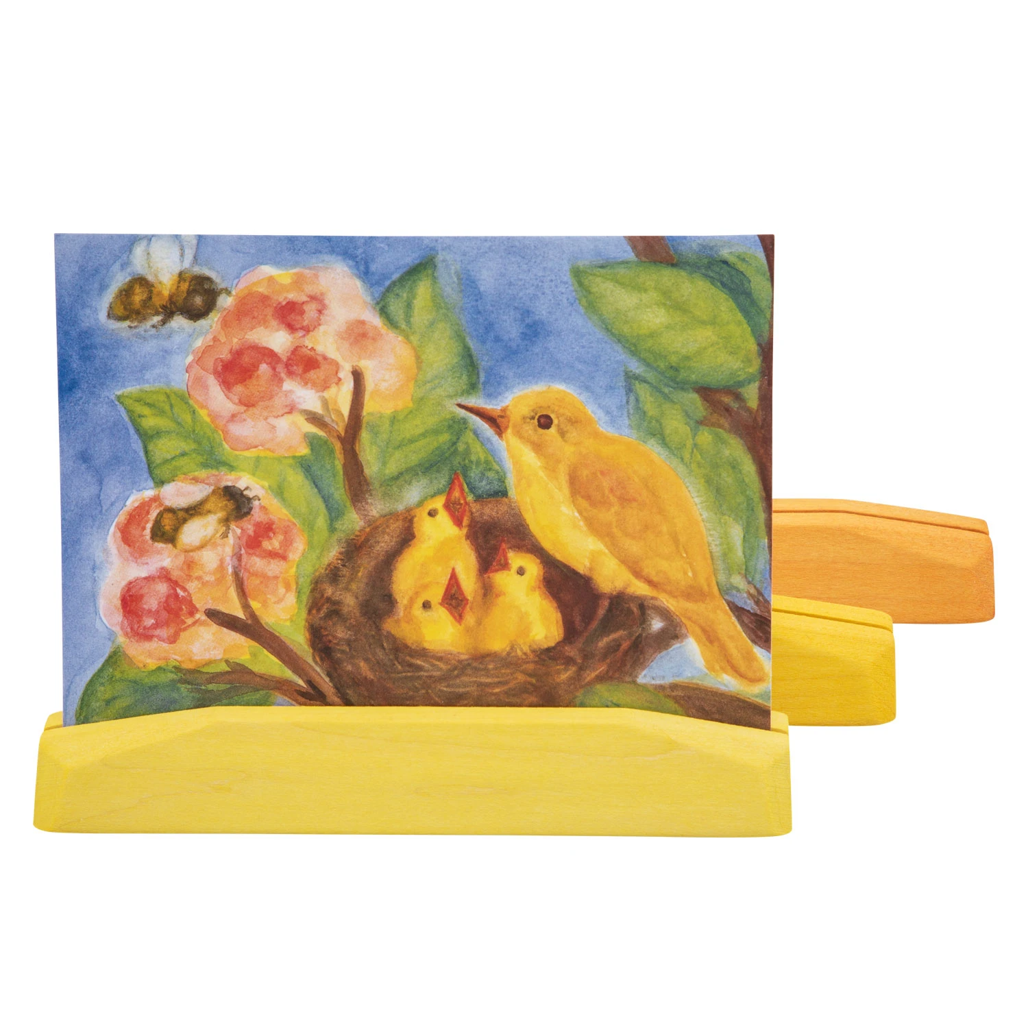 Die Kartenständer sind aus gebeizten und geölten Lindenholz gefertigt. Das Set besteht aus drei verschiedenen Gelbtönen, welche sich besonders für die Sommerjahreszeitentische eignen. Die Holzmaserung kommt durch die lichtdurchlässige Lasur zum Tragen. Postkarten im Format DIN A6 finden im Hoch- wie auch Querformat ihren Platz.