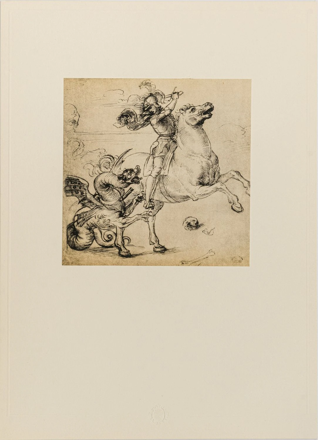 Mit dieser bewegten, spannungsgeladenen Darstellung des Kampfes des Hl. Georg mit dem Drachen zeigt sich Raphael von einer neuen Seite als Dramatiker. Die vorliegende Zeichnung lässt, nicht nur durch den energischeren Gesichtsausdruck des Hl. Georg, sondern auch durch die entschlossene, kraftvolle Strichführung, den effektvollen Hell-Dunkelkontrast und durch die Konzentration auf das Hauptgeschehen, dieses dramatische Element des entscheidenden Momentes noch stärker empfinden als die ausgeführte Fassung im Louvre.