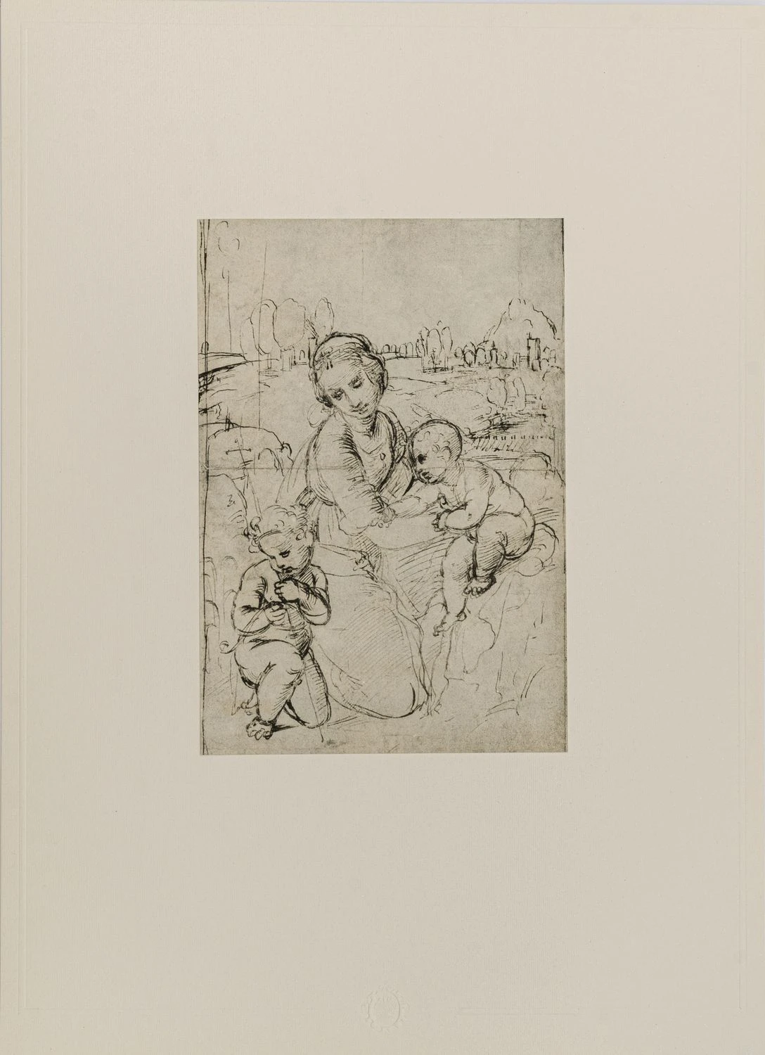 Gegen Ende seiner Florentiner Zeit, 1508, griff Raphael für eine seiner »Herzensangelegenheiten« (Fischel), die sogenannte »Madonna Esterhazy« (heute Budapest; unvollendet) noch einmal auf ein von Leonardo übernommenes Gestaltungsprinzip zurück, das auch schon seinen zwei Jahre früher entstandenen Madonnenbildern (»Madonna im Grünen«, Wien; »Madonna mit dem Stieglitz«, Uffizien; »Schöne Gärtnerin«, Louvre) zugrunde lag: Maria, schräg in einer Landschaft mit hohem Horizont sitzend, mit den beiden Knaben eine Dreiecksgruppe bildend. Gegenüber dem ausgeführten Gemälde, wo die Szene in eine rein römische Ruinenlandschaft gesetzt ist, trägt die Landschaft der Zeichnung vor allem durch die dargestellten Zypressen noch ausgesprochen toskanische Züge.Die Zeichnungen von Raphael Santi (Raffael da Urbino)