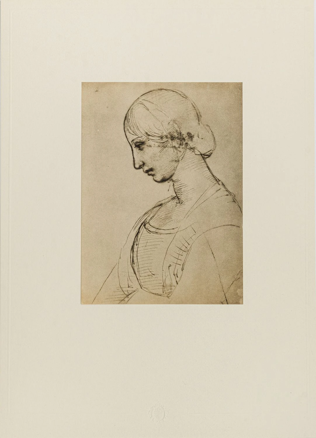 Dieses stimmungsvolle Bild einer in strengem, fast gemmenhaftem Profil wiedergegebenen jungen Frau ist möglicherweise eine Einzelstudie für die Magdalena im Zusammenhang der Vorstudien für die »Grablegung Christi« von 1507. Daraus würde sich die sinnend-verhaltene Trauer erklären, die die Frau als in die Betrachtung des toten Christus versunken sich vorstellen lässt. Die Zeichnungen von Raphael Santi (Raffael da Urbino)