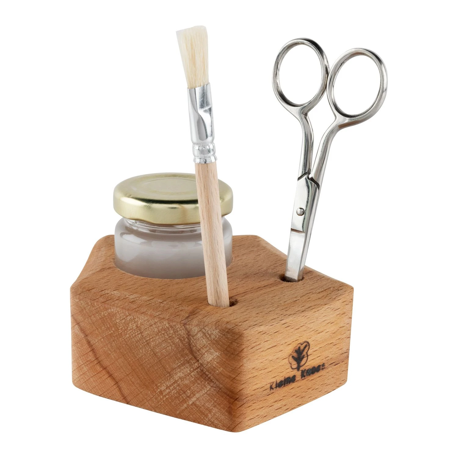 Massiver Halter für Leim und Pinsel, optional mit Schere, aus Buchenholz, in zwei verschiedenen Ausführungen.