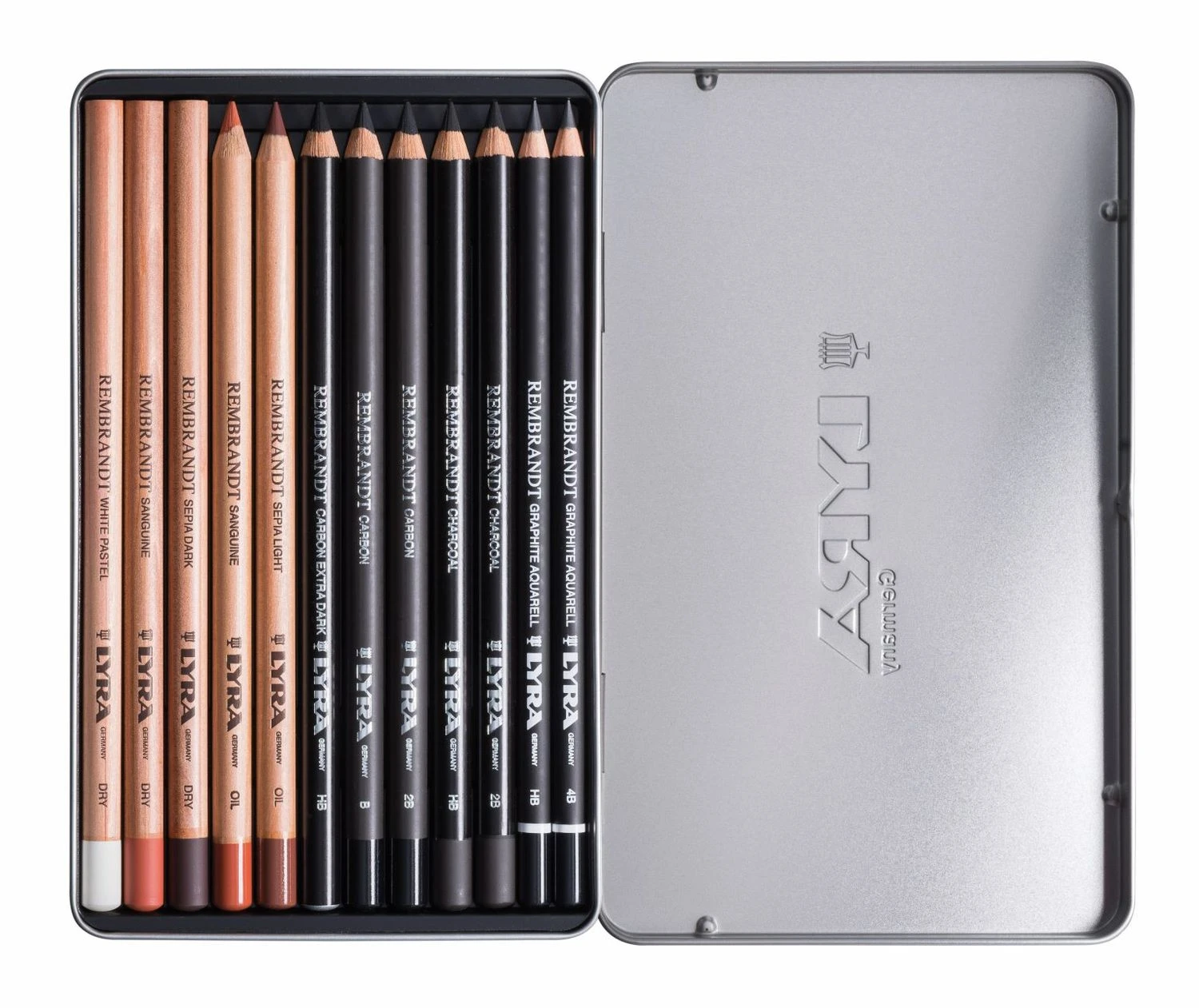 Zeichenstift Set von Lyra im Metalletui mit 12 qualitativ hochwertige Skizzierstifte. Inhalt: 2 Graphit-Aquarellstifte, 2 Reißkohle-Stifte, 3 Carbon-Spezial-Zeichenstifte, 2 Sepia-Stifte, 2 Rötelkreide-Stifte, 1 Weißkreide-Stift. Maße: 19 x 11,5 x 1,5 cm.
