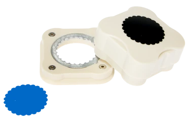 Der magnetische Motivlocher, der frei positionierbar ist Einfach genial. Der Magnetstanzer ermöglicht das Stanzen direkt mitten in einer Papiertüte oder auf einer Heftseite oder mitten in einem Brief. Er ist zwei-geteilt und magnetisch. Der Boden des Lochers wird unter das Blatt oder in die Papiertüte eingeschoben. Der obere Teil des Stanzers dann auf die Außenseite magnetisch aufgeklickt. Nochmal kurz prüfen, ist das Motiv auch richtig herum positioniert? Dann einfach drücken und einen schönen großen Kreis ausstanzen. Der Kreis hat am Rand eine kleinen Kranz, der z.b hinterlegten Bildern einen schöne Rahmen gibt. Die ausgestanzten Motive können z.B mit einem Kinderfoto hinterlegt werden, oder mit farbigen Transparentpapier, und so ganz neue Einblicke auf die nächste Seite des Heftes oder der gestanzten Karte geben. Der Freihand-Locher kann, ohne die Abhängigkeit vom Rand, ganz frei positioniert werden. Einfach in der Anwendung. Auch ideal für Mini-Lupen, Bilderrahmen, Lichtertüten, Zahlenkärtchen uvm…