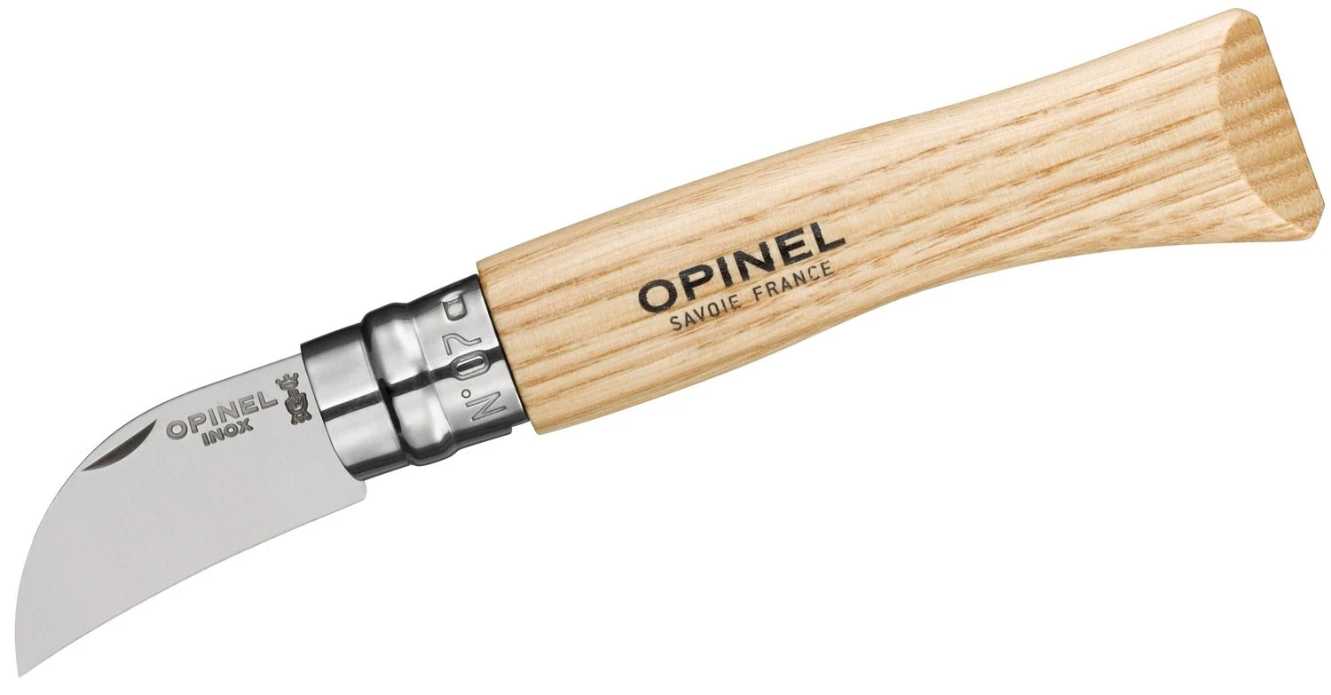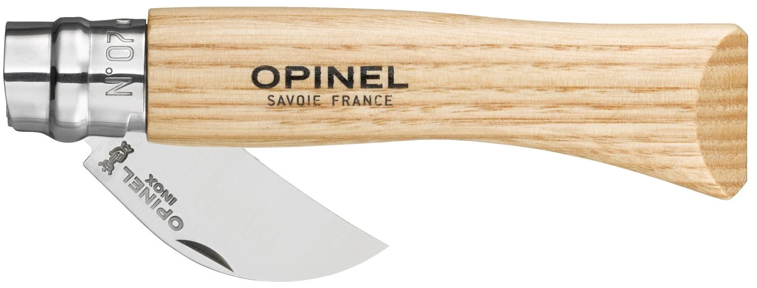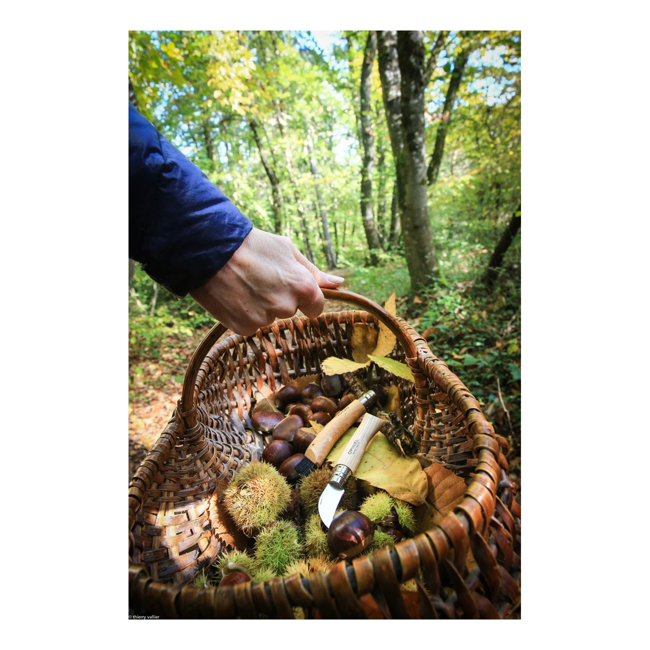 Das in Frankreich hergestellte Messer hat eine 4 cm kurze Klinge aus rostfreiem Stahl Sandvik 12C27M, die wie bei Opinel üblich, mit dem Virobloc Sicherheitsring fixiert werden kann. Passend zum Einsatzzweck ist der Griff dieses Modells aus französischem Kastanienholz gefertigt.