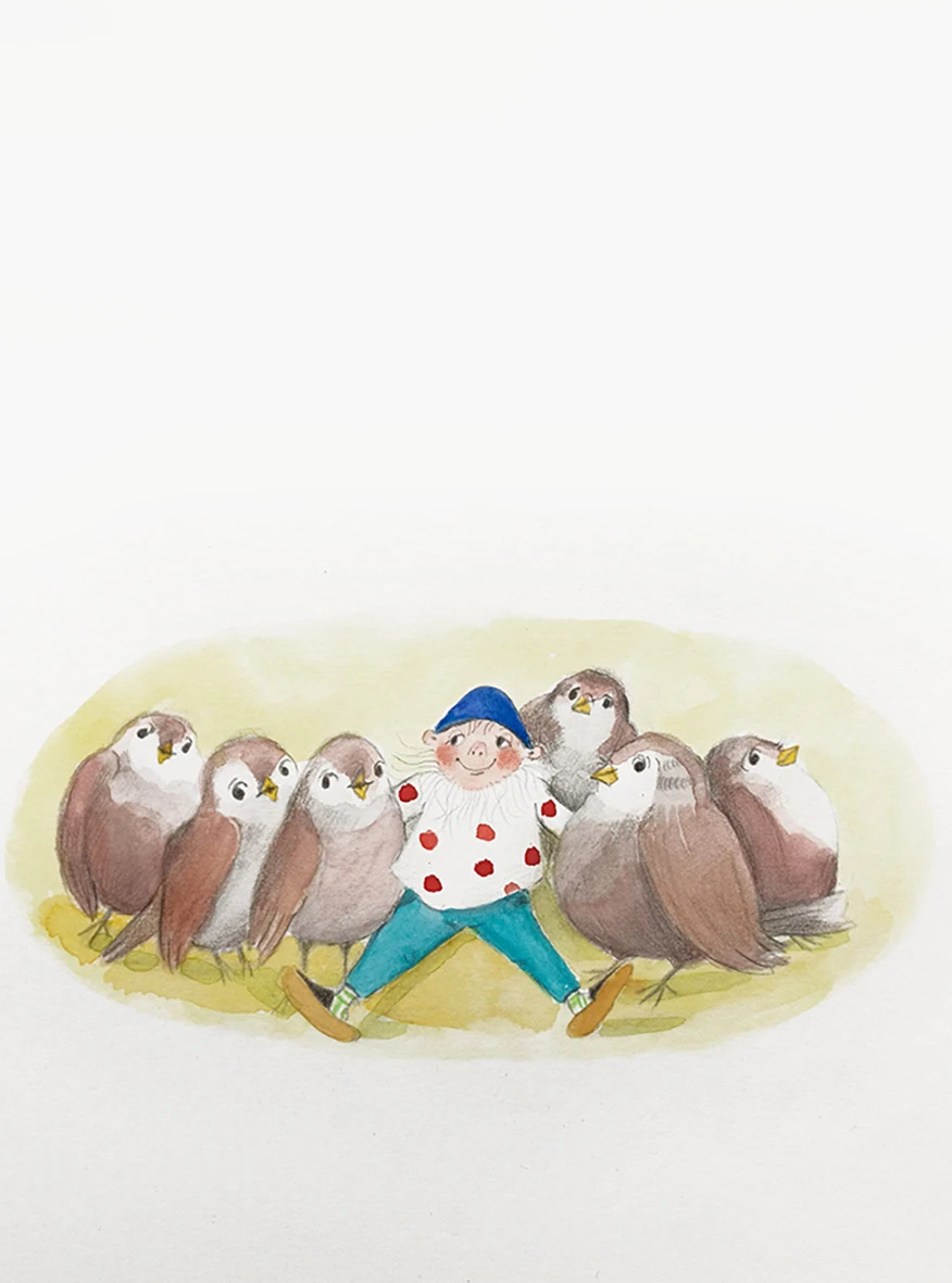»Ach, es ist ein sehr lieber Mann. Er bläst den Kindern feinen Sand in die Augen, wenn sie müde sind, damit sie süß schlafen können. Und ich suche den Sandmann, weil er die Kinder im Großen Haus vergessen hat.«“