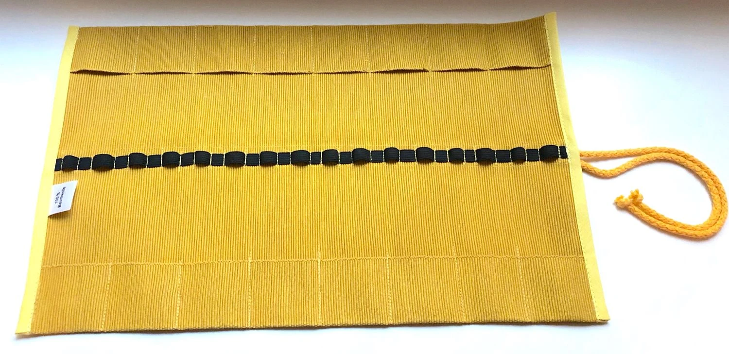 Rollmäppchen aus gewebter Baumwolle, zum Zubinden. Für 16 Wachsmalstifte- und blöckchen.
