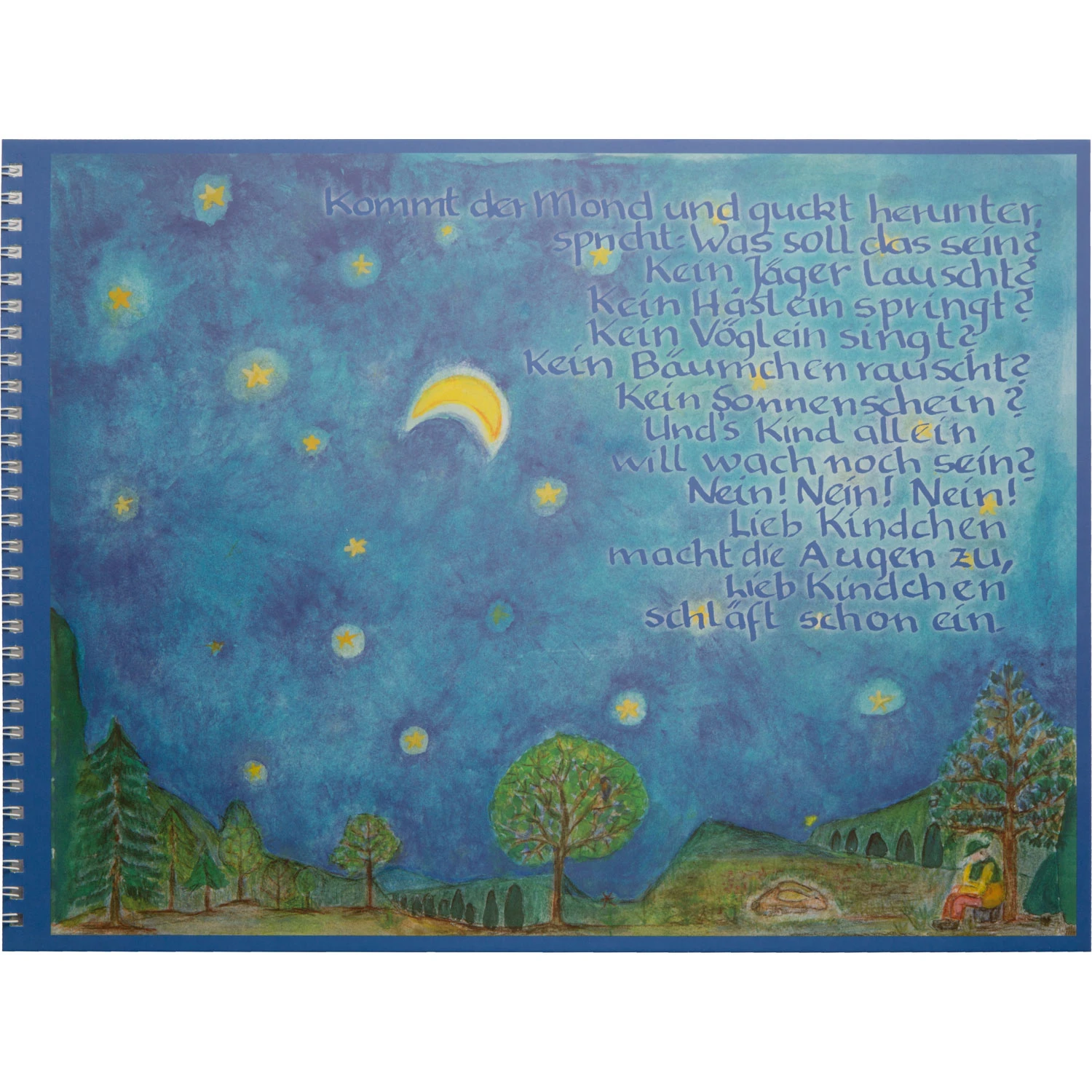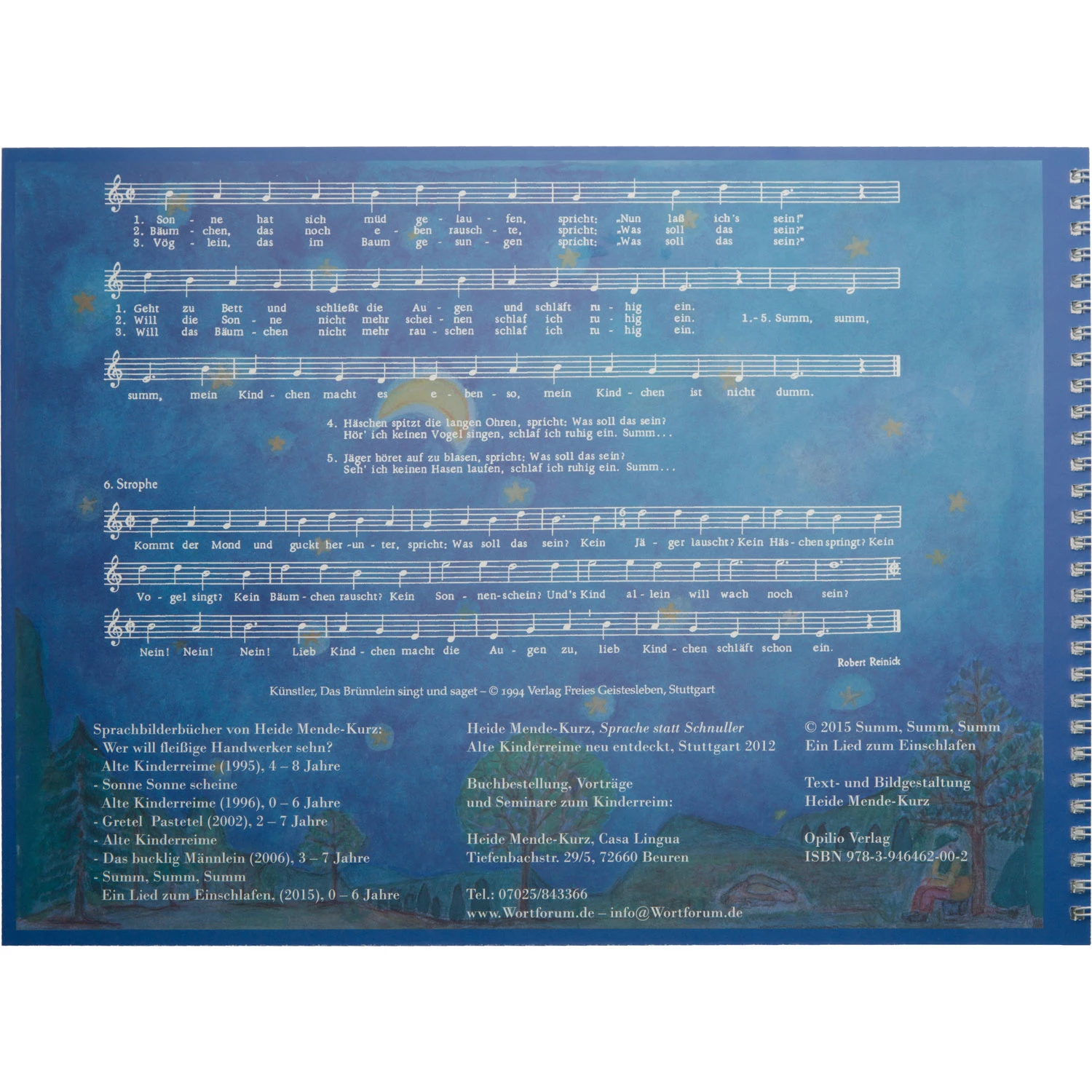 Ein Kleinod ist dieses von Heide Mende-Kurz gestaltete Einschlafbüchlein, pentatonisch vertont von A. Künstler, mit Bildern und Noten auf der Deckelrückseite. Besonders ist der Werdeweg vom Licht der Sonne zum Licht der Sternennacht. Pflanze, Tier und Mensch kommen zur Ruhe. Nur der Mond sieht alle Geschehnisse von rückwärts. Und schon ist das Kind eingeschlafen.