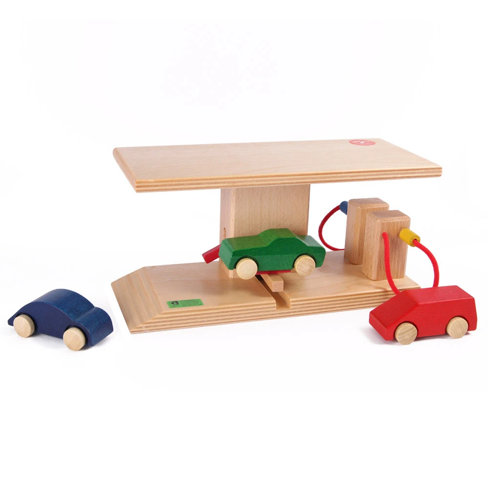 Eine funktionsfähige Tankstelle für Fahrzeuge. Die Tankstelle hat zwei Zapfstellen mit Schlauch und die Fahrzeuge können mit einem Hebel um ca. 2 cm angehoben werden.