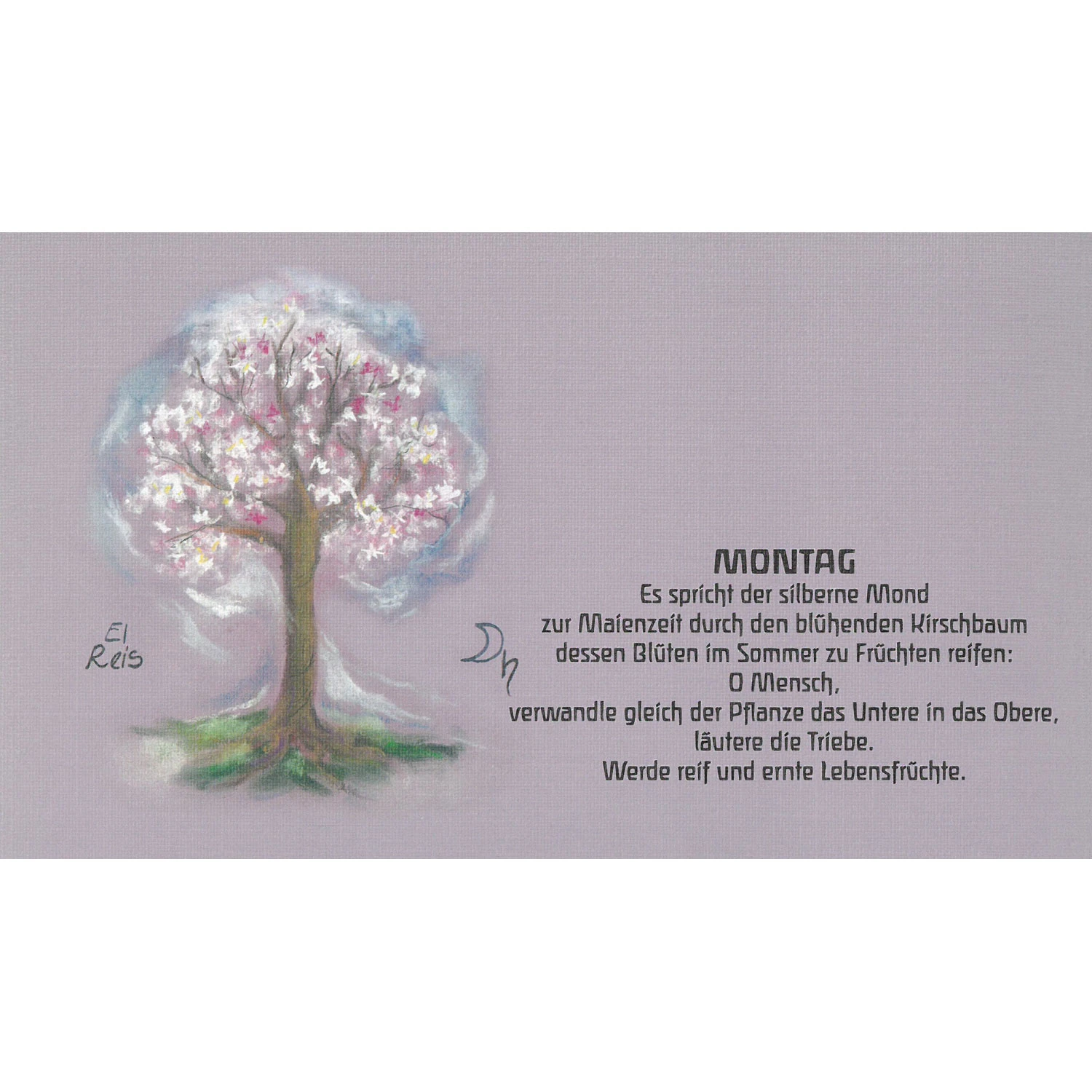 Der Kalender gibt Anregungen die seelischen Qualitäten der einzelnen Wochentage im Erleben aufzusuchen. Jedes Kalenderblatt ist in der dem Tage zugeordneten Farbe gestaltet und enthält jeweils eine Strophe aus den Baumsprüchen von Johannes Hemleben. Gegenstände des täglichen Lebens sind dem jeweiligen Tage zugeordnet. Links unten ist der entsprechende Vokal und die dazu gehörende Getreideart aufgeführt. In der Mitte der Baum, rechts unten das Planetenzeichen und der Ton der Tonleiter. Diese Angaben beziehen sich auf alte Überlieferungen und wurden durch Rudolf Steiner ergänzt. Tischkalender. B 19,8 x H 12 cm.