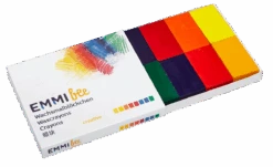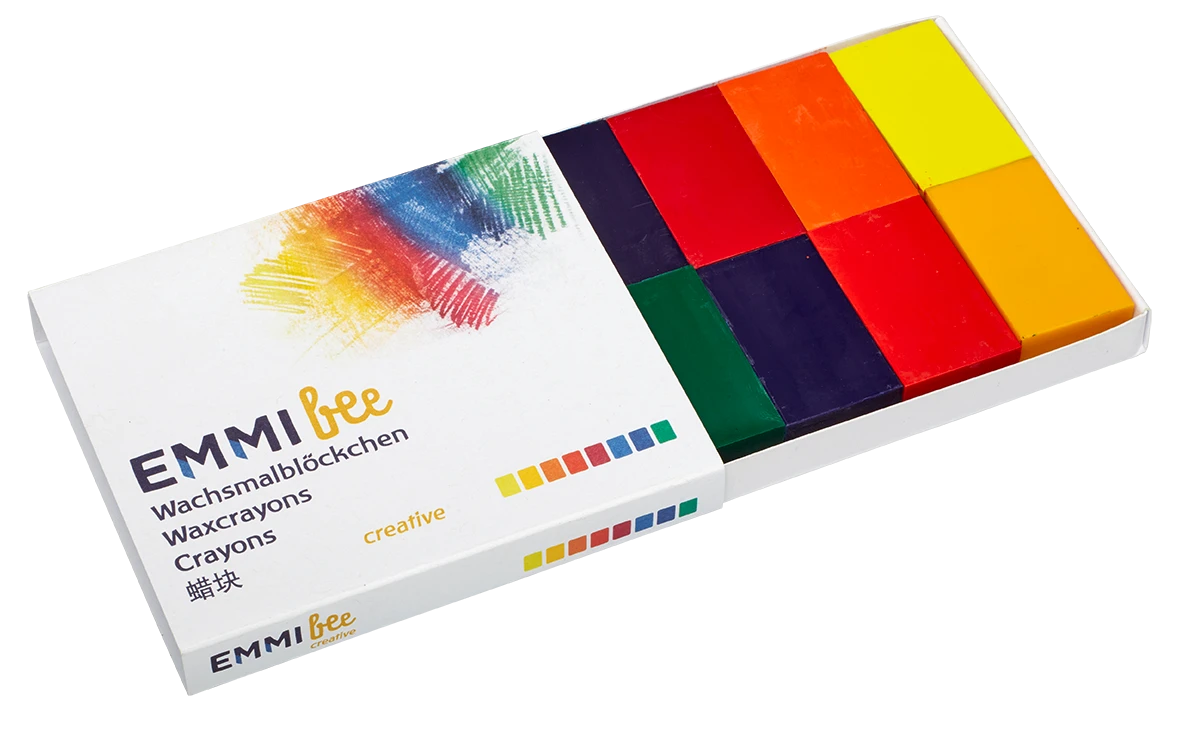8 Wachsmalblöckchen in den klassischen Farben Zitronengelb, Goldgelb, Orange, Zinnoberrot, Karminrot, Ultramarinblau, Preußischblau und Grün. Geringe Farbabweichungen möglich. Die besondere Blöckchenform ermöglicht ein flächiges Malen.