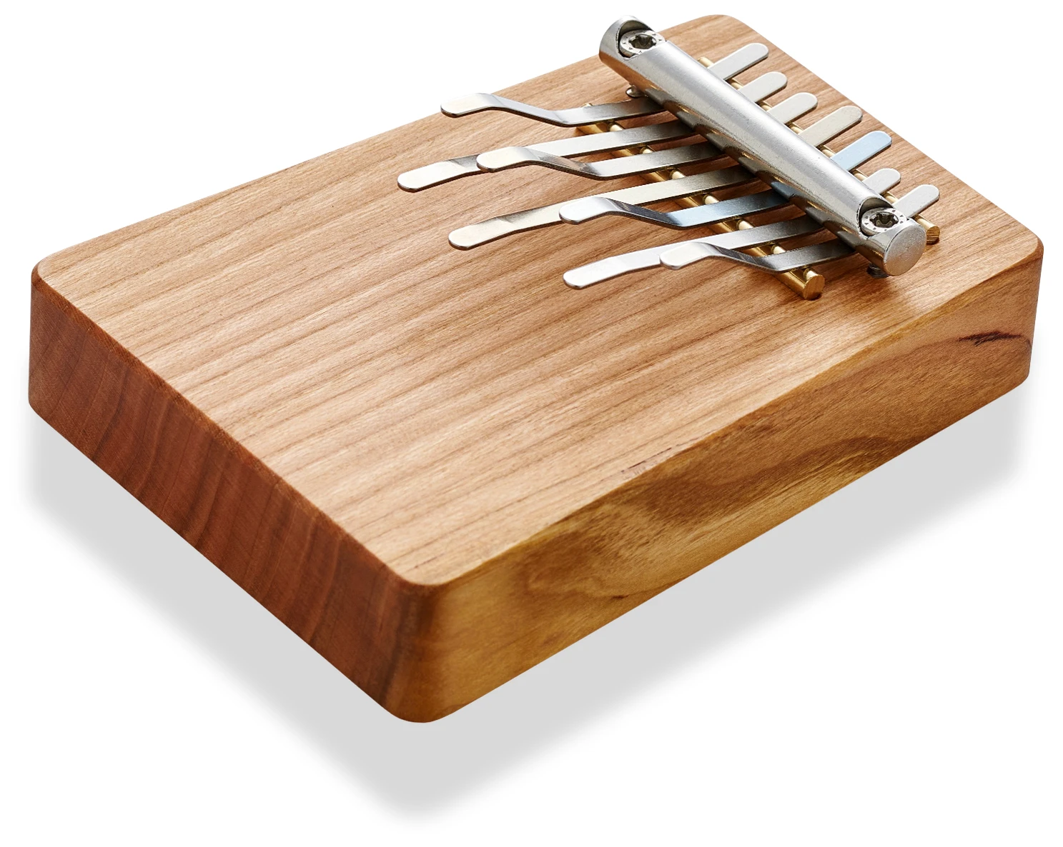 Kalimba “Waldorf 7”, G pentatonisch 432 Hz, D – E – A – D – H – G – E, auf einem Block aus massiver amerikanischer Kirsche.
