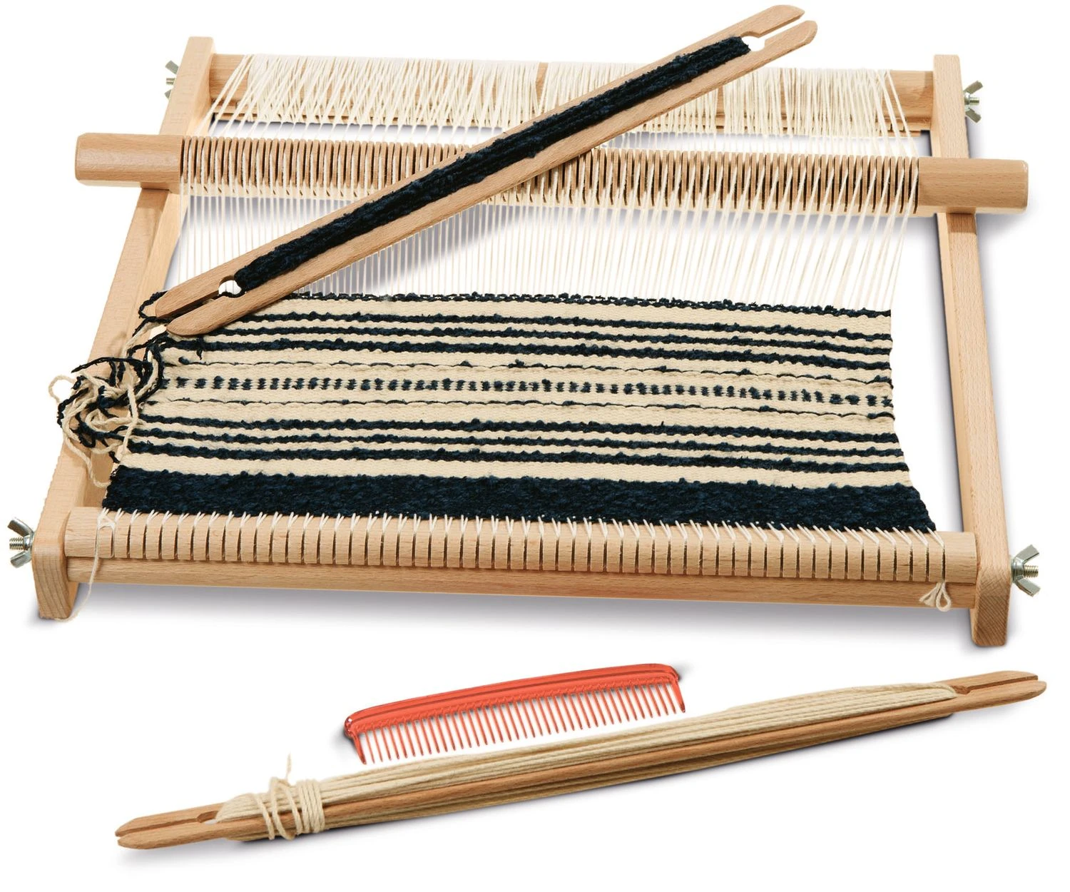 - Inhalt: Webrahmen, Warenkamm, 2 Schiffchen und Anschlagkamm.