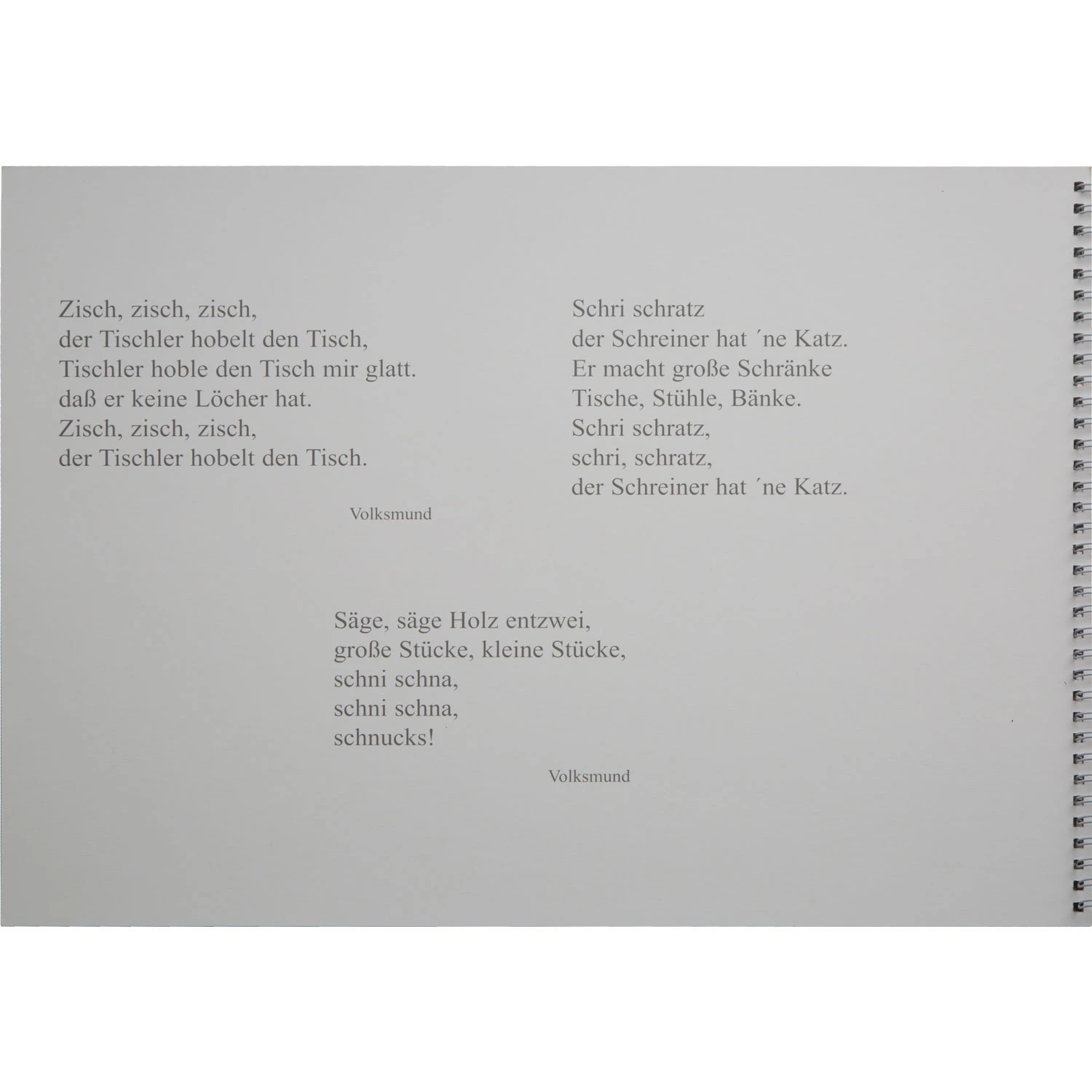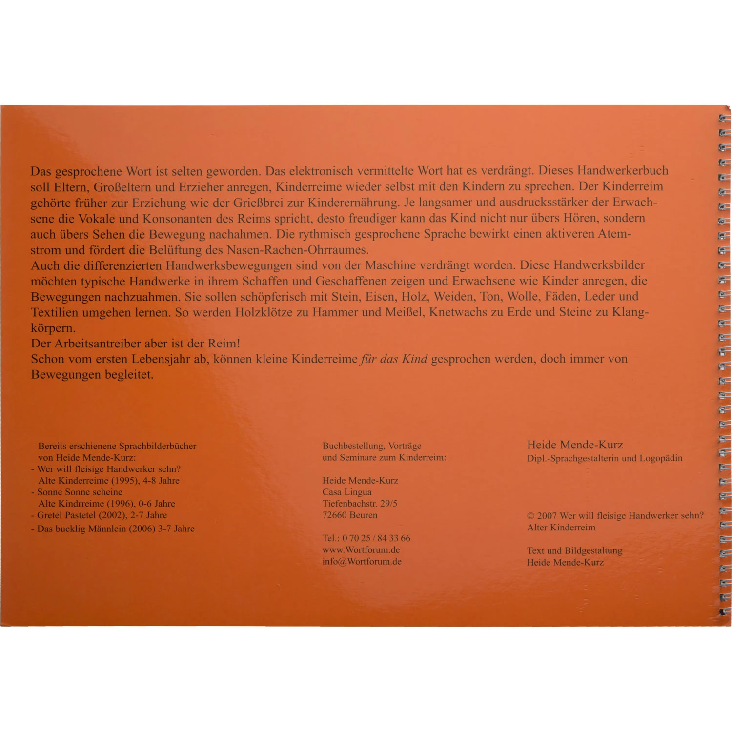 Auch die differenzierten Handwerksbewegungen sind von der Maschine verdrängt worden. Diese Handwerksbilder möchten typische Handwerke in ihrem Schaffen und Geschaffenen zeigen und Erwachsene wie Kinder anregen, die Bewegungen nachzuahmen. Sie sollen schöpferisch mit Stein, Eisen, Holz, Weiden, Ton, Wolle, Fäden, Leder und Textilien umgehen lernen. So werden Holzklötze zu Hammer und Meißel, Knetwachs zu Erde und Steine zu Klangkörpern.