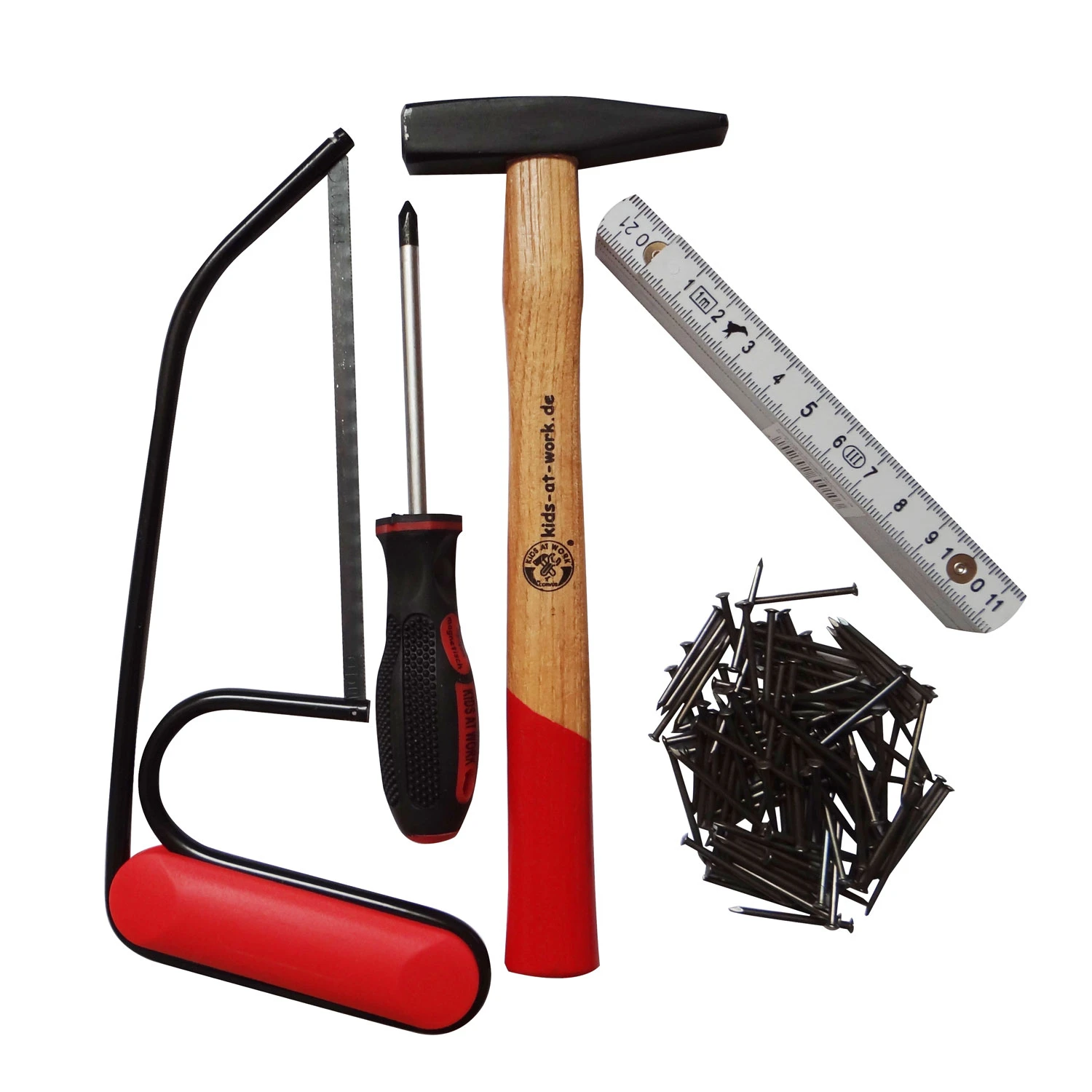 Funktionstüchtiges, langlebiges Werkzeug, passend für kleine Kinderhände. Das Set enthält mit Meterstab, Handsäge, Kreuzschraubenzieher, Hammer und Nägeln alles, was für den Einstieg in die Welt des Bauens und für erste Projekte benötigt wird.
